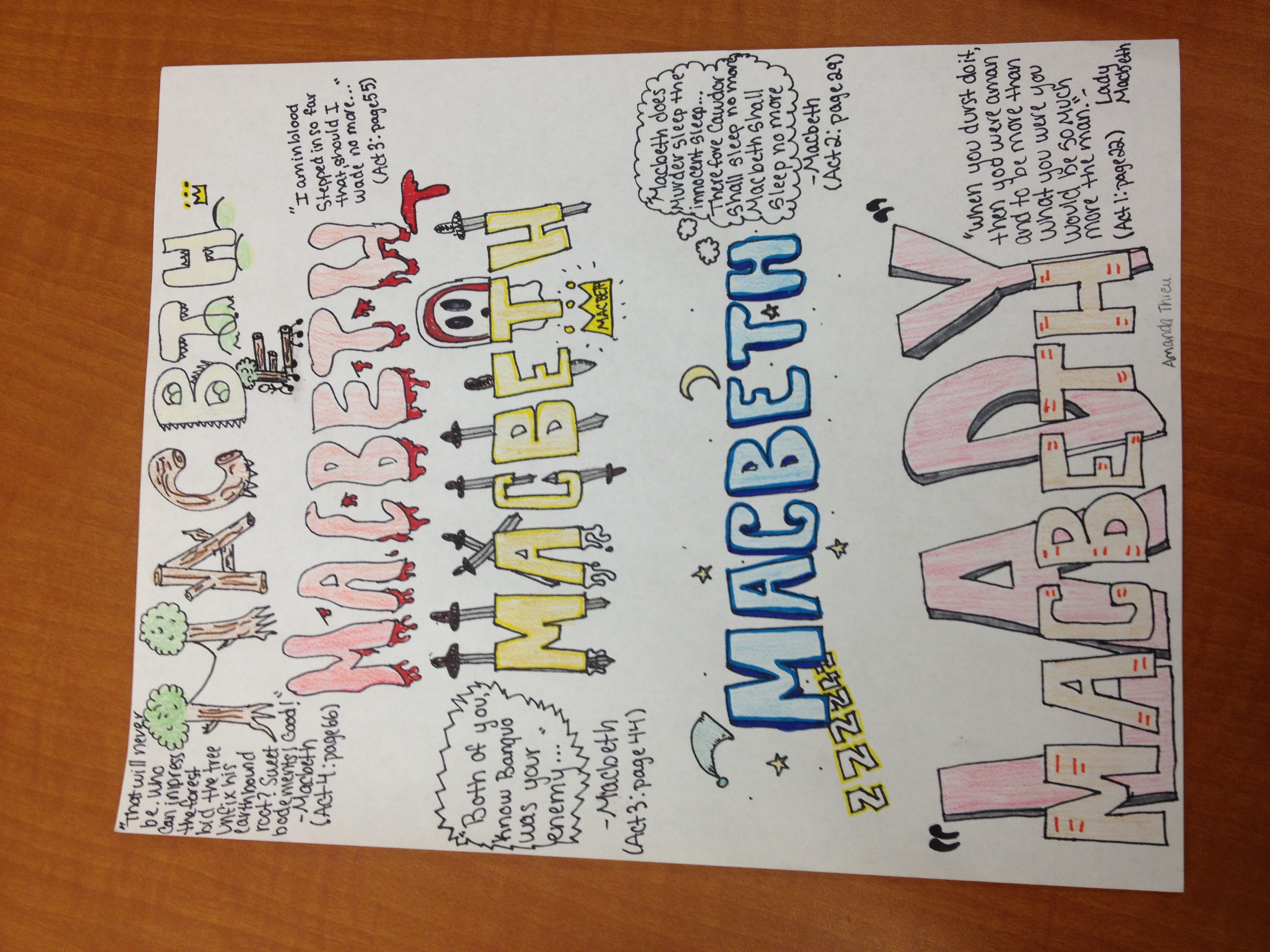 This is my Macbeth creative project for english class. I wanted to show his's stages throughout the play. I wrote Macbeth's name 5 times to represent all the quotes that I incorporated. It also shows that Macbeth's name changes it's font, color, etc because it shows the audience how much his character changes. It goes from bottom to top, Act 1 to Act 4. I used two quotes from Act 3 therefore, I didn't amalgamate quotes from Act 5. For my first quote, Lady Macbeth was conversing with her husband saying that he wasn't a man until he killed King Duncan. That's why I drew LADY over lapping Macbeth to represent the dominance in Lady Macbeth's character. I colored LADY in pink because in the play she was using her feminine features (being a woman) to her advantage. The second quote which is blue is similar with the quote Macbeth saying that he will not sleep innocent any more because he feels extremely guilty on the deed he has done. I drew a night cap, "zzz", moons, and stars to represent his sleep. The third quote which is in yellow represents his royalty and greed. He has finally received the crown and is now convincing the murders that Banquo is their enemy as well. Macbeth is taking over Lady Macbeth's manipulative character trait and using it on the murders. The swords represent how many times Banquo gets stabbed. I drew the ghost of Banquo sitting in Macbeth's seat at the banquet. Whenever you see a gold crown it emblematizes Macbeth. The fourth quote is all red and bloody because the quote regarding that is when Macbeth says he has stepped in blood so deep... The red color betokens the body count that Macbeth has annihilate. The last and final quote which Macbeth recites is that he is not worried that the forest will walk to Dunsinane hill. So I split the Macbeth in half, I drew "MAC" in trees to represent the forest and the "BTH" as the hills. I had the idea to draw the "E" the moving people who carried sticks to the Hills and the crown exemplify where Macbeth is located which is in the hills. All of these Macbeth's are written to show the change in his personality once he was crowned King of Scotland. Since I love to draw and paint, this wasn't that much of a challenge for me. I'm most proud of the creativity I put into the project. I would change the quality of the work. I might add more quotes next time.