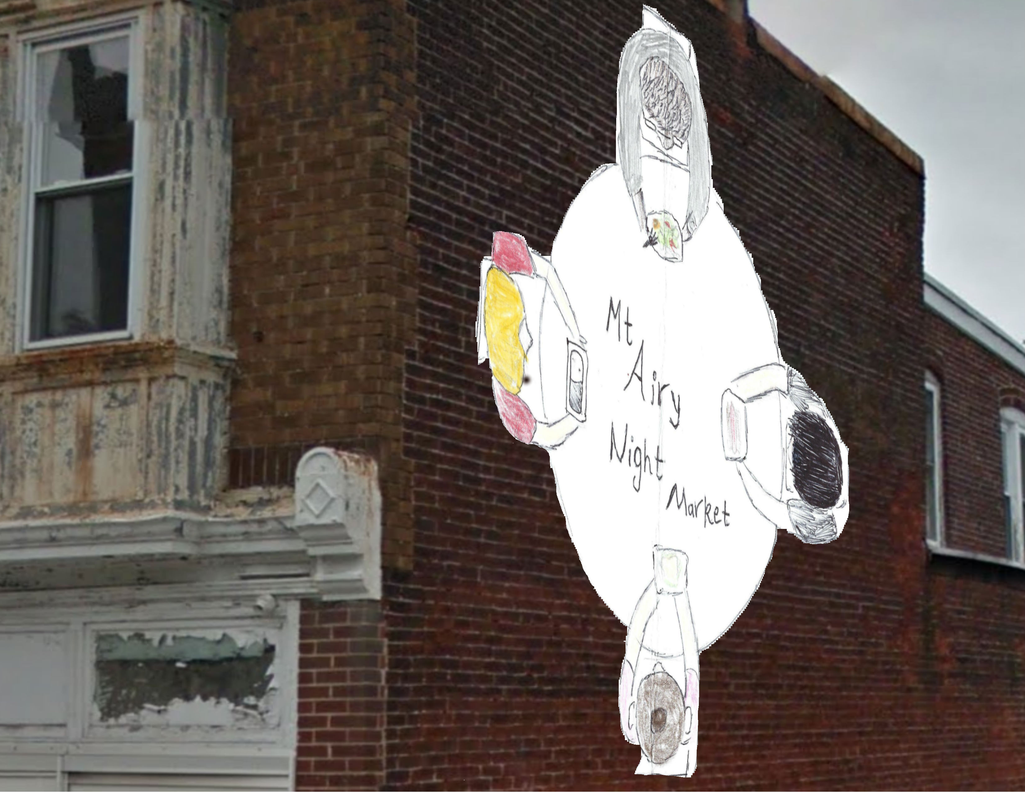 A pesar de los muchos murales en Mt. Airy, voy a poner mi mural aquí. Mi idea se llama “Mt. Airy Night Market.” El Night Market es un evento en Germantown Avenue una vez al año. Un parte del Germantown Avenue esta cerrado. Mesas y sillas están en la calle, y personas comen en la calle. Hay camiones de comida y muchas personas. A causa de su importancia en Mt. Airy, creo que lo necesita documentar en un mural. Este mural va a mostrar el Night Market. El mural va a tener una mesa con un grupo de amigos. El mensaje es, más o menos, es “Ve al Night Market!” y “Ve al Mt. Airy!” Existe para documentar una parte importante del Mt. Airy.