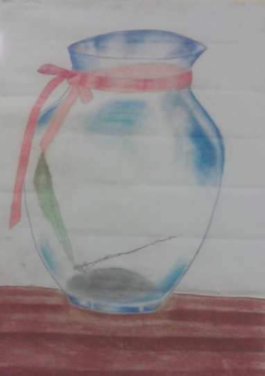 The best part in this quarter for me was drawing my large glass charcoal still life because it was the first time I dared to use colored charcoal. I was inspired to use colored charcoal after looking at one of Emma Hoeinstein’s art pieces. It was a still life of a water bottle and it looked extremely real because of the different colors that Emma incorporated into the piece. In my drawing I used blue for the light reflected on the vase, pink and dark pink for the ribbon on the vase and the shadows cast on said ribbon, brown and green for the leaf that was placed inside the vase, and brown for the wooden table.