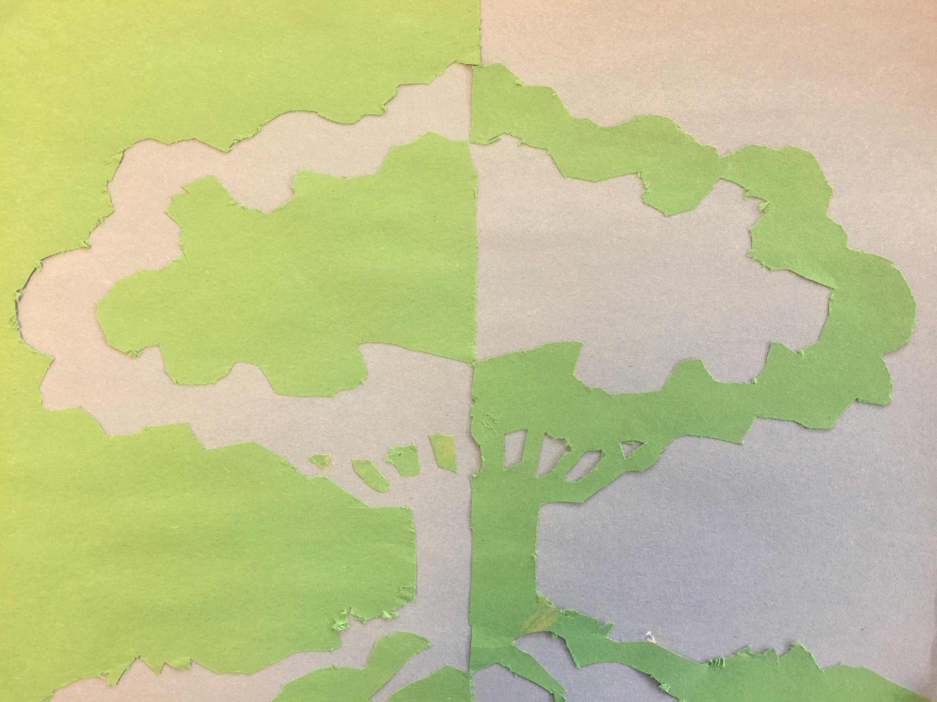 If you focus on one color on one side in this cutout (perhaps the green on the right side as an example), then you are focusing on either positive or negative space. On the right side, the tree is green, and the tree is the main focus of this cutout (it's the positive space). The blue just serves as a background. The left side is mainly just invert to the right, making the green serve as negative space.