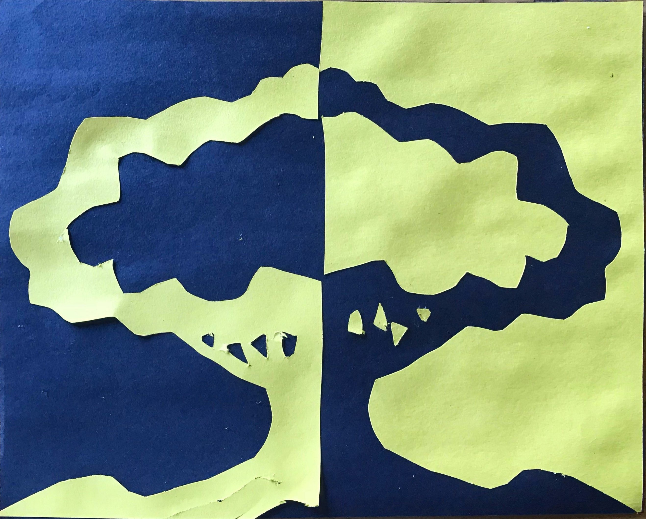 I first cut out the image from the white paper. Then I put those pieces onto the yellow paper, the color that I wanted the tree to see. I placed th image of the tree on the yellow and cut it out. From there, I placed the yellow tree on the black paper, the color that I wanted to be the background. I placed one place of the yellow tree, or rather the background of the yellow tree, on one side. From there, I just flipped the image to mirror the missing part.