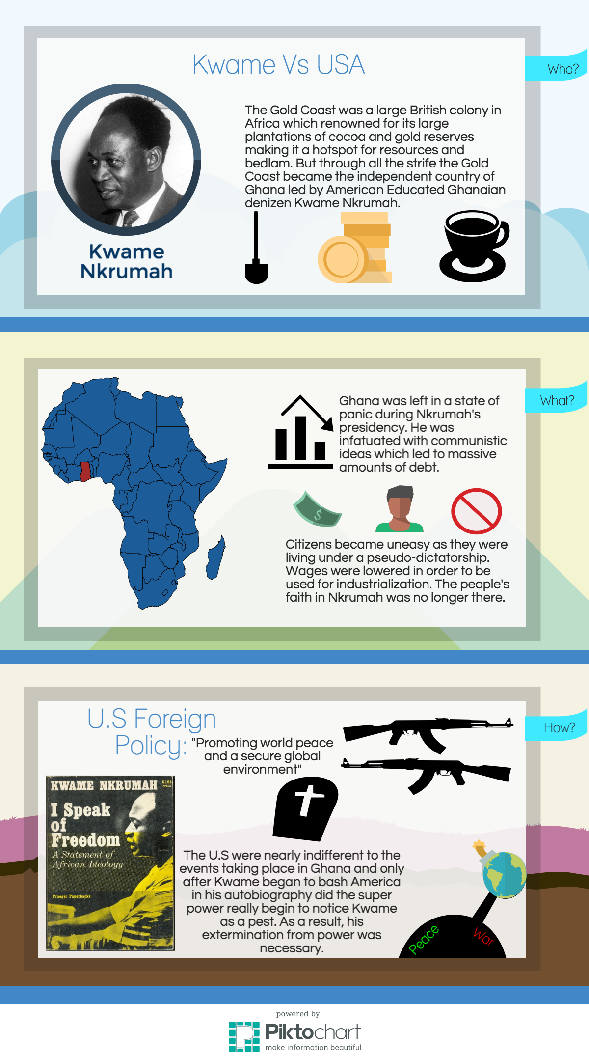 We chose to write about the U.S financial involvement in Ghana because it was different from any other instance of U.S foreign involvement. The U.S used its financial power to influence countries across the ocean and showed once again that it is a super power.