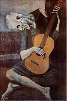 Para mi, la pintura se trata de un hombre pobre que recibe el dinero de reproducción la música en la calle. Los colores en la pintura son oscuro y gris. El parte con el más color es la guitarra de el hombre. No me gusta la pintura porque me recuerda los izquierdistas y no quiero pensar de ellos. La pintura es centrado a el hombre y no hay un fondo. Que parece el hombre se está muriendo. El hombre es viejo y no está usando muchas ropas. Él es probablemente frío. También, el hombre probablemente no ha comido durante mucho tiempo porque en la pintura él es muy flaca. El hombre es pobre porque él tienen ragones en sus ropas. El hombre es también muy cansado porque su cabeza es apoyándose en su hombro. El hombre es conciliar el sueño o está muriendo. El hombre no puede mantenerse despierto.