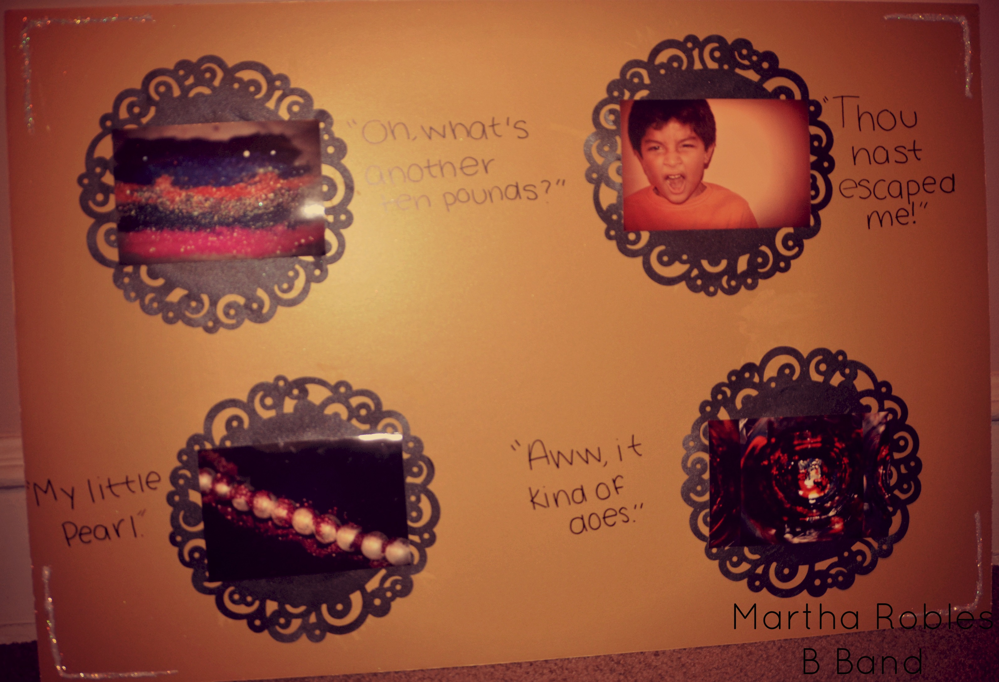 Red - Strength /BloodIn this photo we see a pearl necklace covered in red. The pearls not only representing little pearl but also representing Hester Prynne. It is also covered in red because red stands for strength and blood. He shed so much blood because of the strength he had to keep it all a secret even though in the end it was all thrown out the window. He ended up giving up his own secret to the people of puritan Boston. He was no longer able to hold in therefore killing himself in the end, hence the red for blood. The pearls also representing the forever link he had to both Hester and Pearl even if he had kept it all a secret.