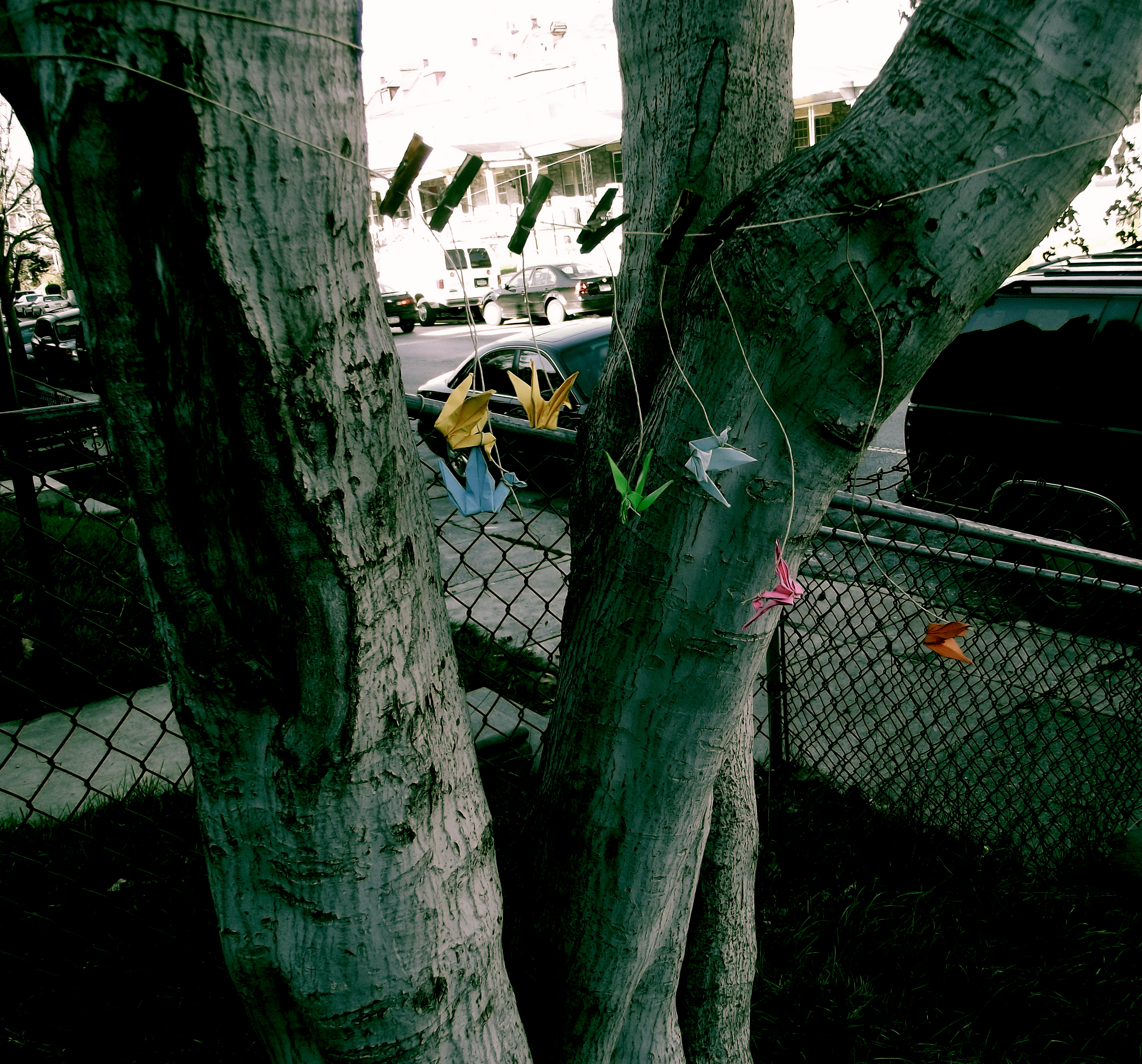 neck of the origami swans. Then, I attached the swans to the tree using the