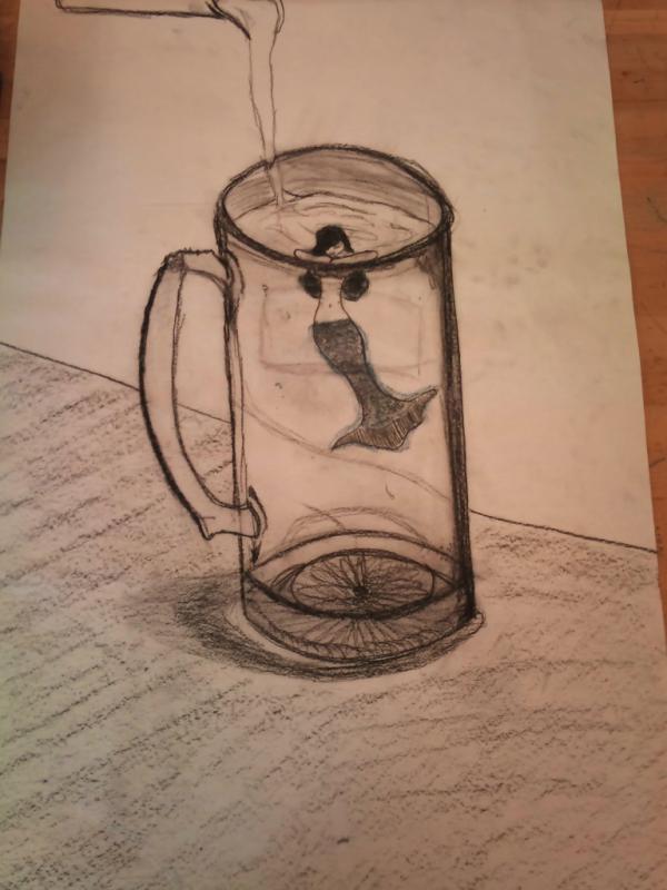 During the Second Quarter of my Junior year, I was asked to create a list of things for my art class and accompany each of them with an artist statement. Below is exactly that. The first picture is a charcoal drawing of a large clear object.