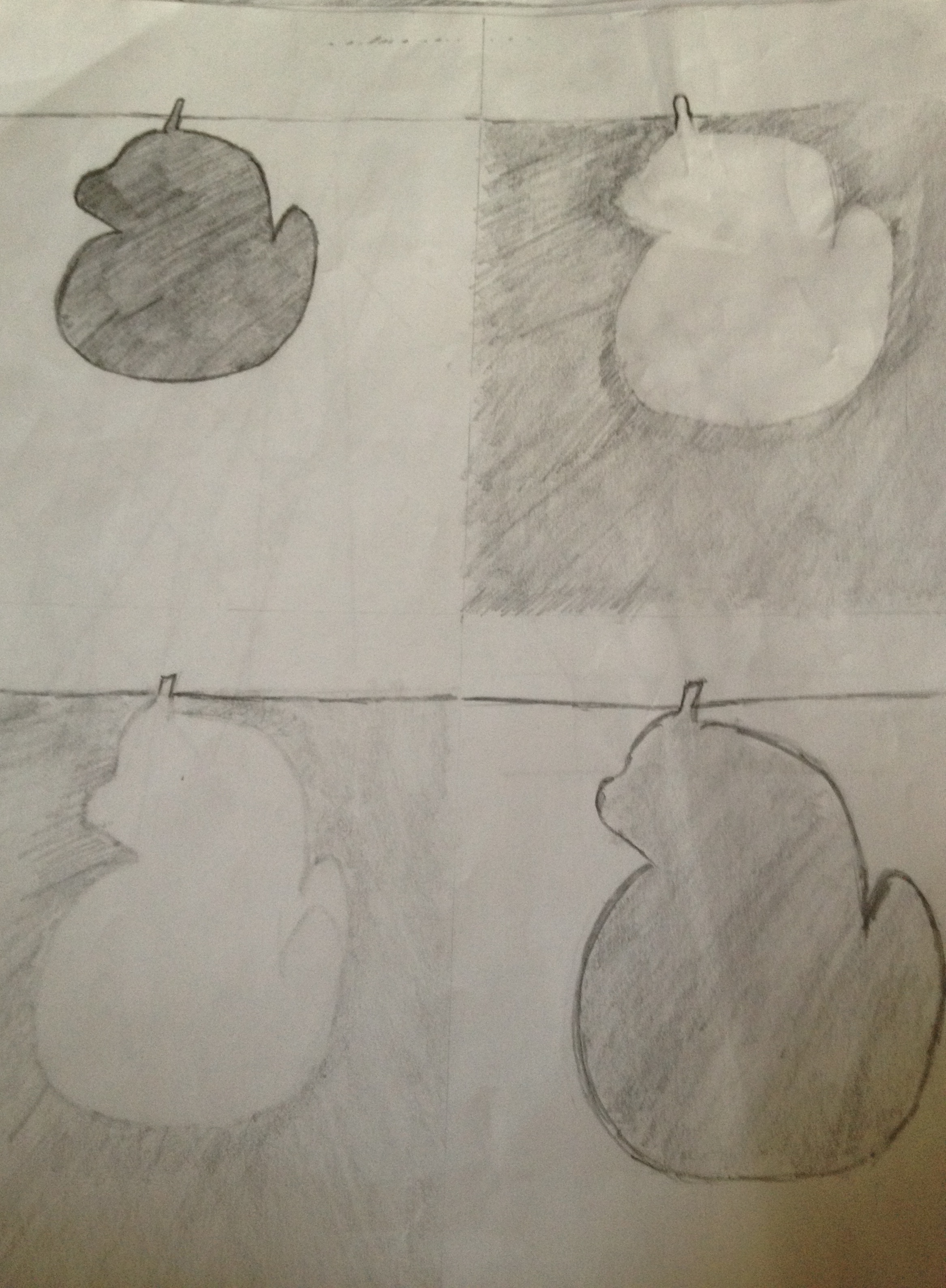 Well, in this quarter Ms. Hull had us go on this website called Drawingspace.com. This website has interesting lessons on how to draw. I started from the basics on Beginner Level starting at B. B is the Learn to See section, which means “As an artist, can visually explore everything around them from their own unique perspective, and with new purposes, such as discovering drawing subjects.(Drawing space)” So we did all the mini lessons and drawings with in that section. I learned how to see the object, and draw it. For example the duck, instead of drawing the duck I drew the space around the duck. My duck then got lots of shape and came out wonderful. Refer to the duck at the bottom of the blog. I also feel like shading had a big part to do with this section. Simply because I shaded several of my pictures so that it comes out more defined. I feel as though several of the examples came with knowing how to shade.