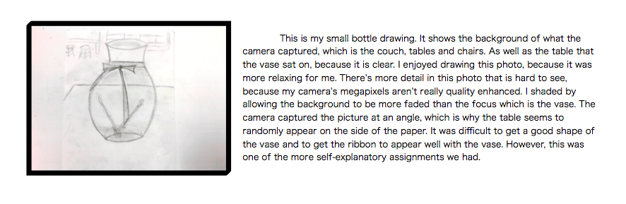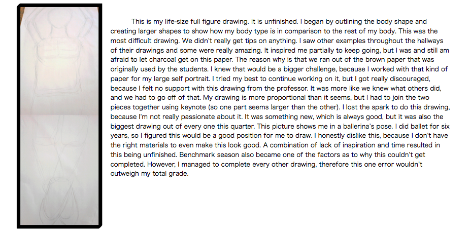 The photos include my artist statements about the photos next to the final pictures. I think the instructor could have done a better job with paying the students more individual attention or taking time to ask us as a class how we feel about drawing the different assignments. A drawing per week was a little bit too much, but in the end I did the best that I could. One thing I could have done better was to seek for help with the drawings, however I am more personal about my work. Also the skill requirement for the quarter was a little high, so the expectations were higher. I did better than I expected, but I guess I could have done better by balancing my elective with other classes so that I could devote more time into these projects. With some of these, I feel that the class needed more time to do it, more instruction and more support. It would have been nice to have a break in between drawing- or something different that still counted as an art piece to show our own creativity.