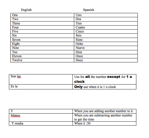 Before you learn how to tell what time it is, you have to know numbers 1-12. You also would need to know when to use the words es la and son las. Last but not least, you need to know the meaning of menos and y media and when to use it. The chart below it will show you all these things.