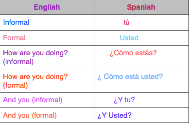 Respecto Posted by Tiarra Bell in Spanish 1 - Manuel on Saturday, November 3, 2012 at 10:08 am Respecto:In order to know how to speak informal and formal you have to know:Screen Shot 2012-11-03 at 10.05.56 AMHere is a video of Carlos being told how to respectfully address an adult or elderly person: Comments No comments have been posted yet. Log in to post a comment.