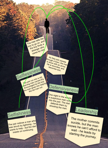 In the roadmap I made, I included notable events from throughout the book. Specifically, I included events from the book that had lessons to be learned from the Dad’s responses. The first 4 events I included have qualities over the description - they were events where the Dad’s actions showed leadership, selfishness, defensiveness and selflessness. Above each of the qualities, arrows go further up along the road to connect to where the boy currently is.