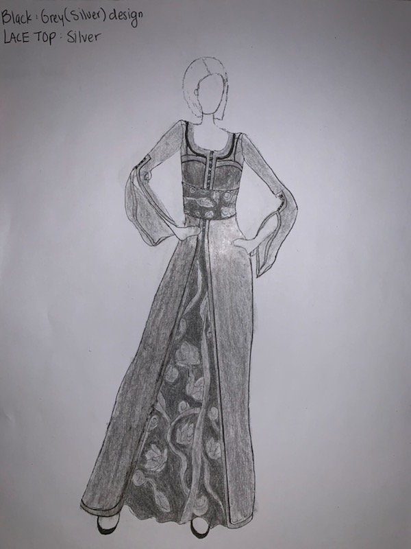I took many steps over the past few months to complete this project of course, because there are many steps to put this all together. This project required lots of time and thought. In order to do this I needed to brainstorm my thoughts first then I need to create my templates and sketch out my dresses. After that I needed to outline everything with black and then begin designing. Lastly, I needed to put in the color and accessories. After that, I had to completed all of those steps I need to begin planning how I will put together my slides to show my process. To put all of those steps together I included the real life examples as well when presenting. Throughout this process, I also met up with with Moroccan women and classmates for input and advice on my designs. My grandmother and my aunt were my biggest inspirations during this time, not only because of the huge amount of assistance they provided but also because they passed on their love for our culture and fashion onto me. I am delighted to say that I am proud to continue this family traditional talent.