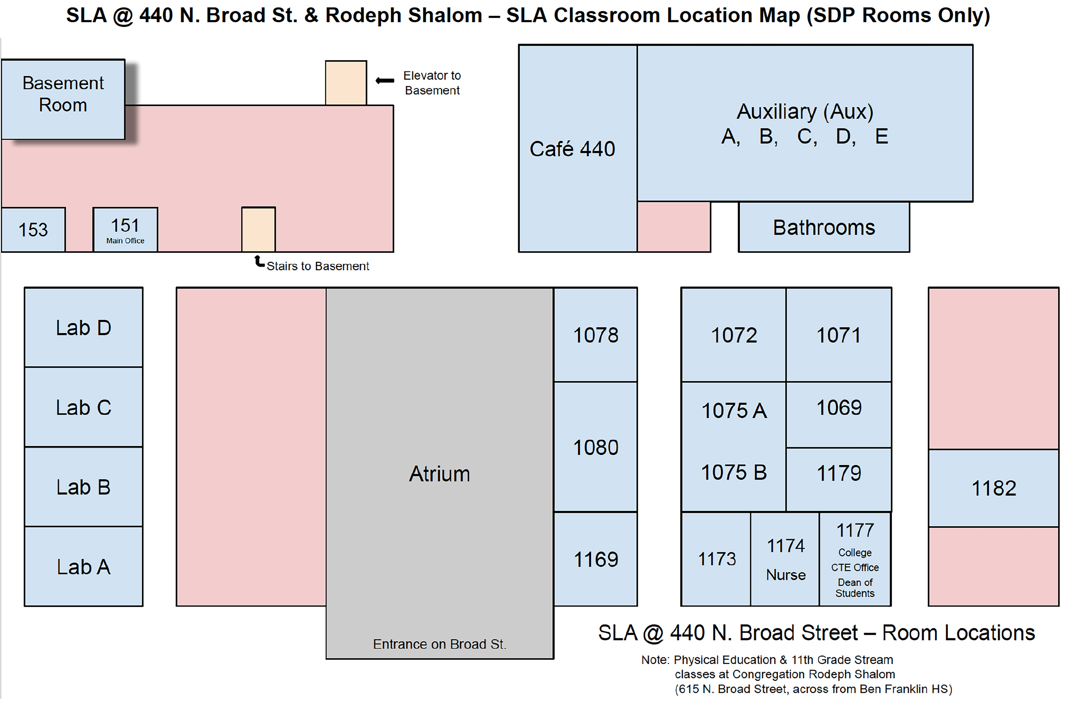 Included below are reference lists and diagrams to help students navigate the SLA campus model. Students can refer to the list of teacher classrooms, the school’s master schedule grid with room numbers, and a room location map of the School District of Philadelphia space we are occupying. A spreadsheet of these reference documents can also be found at https://tinyurl.com/SLA440CampusModel