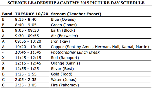 Picture Day will be held in the school library on Tuesday, 10/20. All students will be photographed for the yearbook, free of charge. On Thursday, 10/15, students will be sent home with hard copies of the picture day order form. Families who are interested in buying photo packages should complete the order form and submit it, along with payment, to the photographer at the time of the student's photo sitting. An electronic copy of the order form can also be requested via email to sreddy@scienceleadership.org.