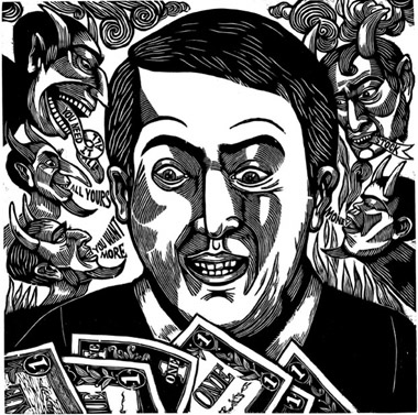 I noticed that in the picture the guys conscious looks like almost devilish. I wonder if the guy in the picture always listen to these "bad" conscious, maybe that's the reason why they have come to look the way they are. What if this printmaking is showing what greed can do to a person's mind to make them believe that it is okay.
