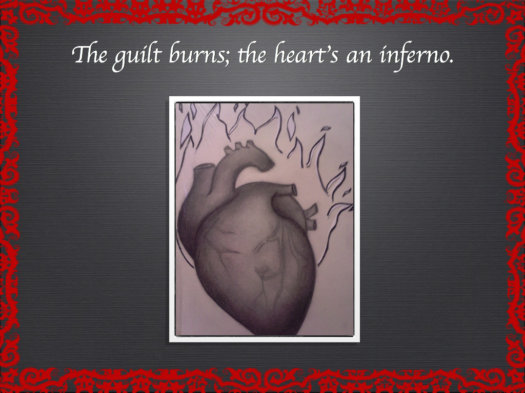 The theme of my creative project is “secrets and their consequences.” I got this point across by making a succession of heart drawings that could represent how secrets could affect a person. The first is a heart that has a lock and chain on it. As a caption for the picture I have, “Hold them back, seal them away.” This symbolizes someone who has a secret; they would try to hide it from the world, and in the process, they would hide themselves and their true feelings away. The second heart has a lock pointing towards the lock and chain. The caption I have is, “Prying eyes see through the lies.” This symbolizes people who may try to see past the exterior of a person and potentially find their secret. On the third heart, the lock is unlocked and the chain is falling. The caption is, “Collapse in character, lapse in security.” This symbolizes what happens when someone is afraid that someone may know their secret. They may become paranoid and start acting out of character because they are afraid they could not hide their secret. The fourth heart is on fire. The caption is, “The guilt burns; the heart’s an inferno.” This symbolizes the guilt someone would experience while holding the secret. It would feel like the secret is burning them from the inside out. The last picture is a pile of ash. The caption I have is, “Destroyed from the inside out, scorched soul, blackened reputation.” This symbolizes someone after they have held their secret for so long. Either they would feel terrible about holding that secret or someone would find out about their secret and no longer trust them; it would ruin what others think of them.