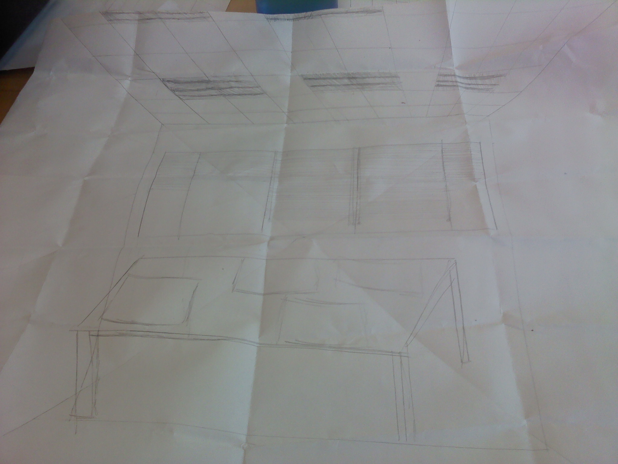 This is my drawing of the farthest wall on right of my art class. What we did for this project was we learned the measurements for a room, and how to draw them realistically on a piece of paper. we used rulers, and had to include everything in our drawings (three dimensionally) to make it look as realistically as possible. I drew the table in the center back of the room, the ceiling as it'd be seen from a three dimensional view, and the window shades above the table!!