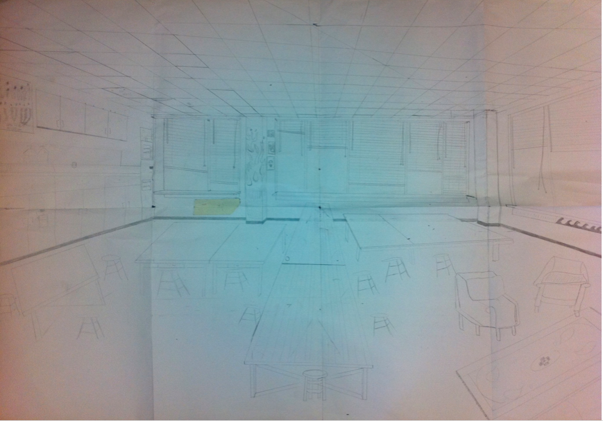 Wondering what you're looking at? This is a picture of my perspective of Ms. Hull's art studio. We started off drawing in our sketch books after watching a tutorial of how to draw things using orthogonal, horizontal, vertical, and diagonal lines all connecting to the vanishing point. After drawing the tutorial (Right side window, left side door, left side floor mat, back wall, and sky light / drop ceiling), we started on a new one and learned how to draw a pole connected to the corners, ceiling tiles, and ceiling lights. The next class, we were ready to do the real thing. Ms. Hull gave us all uneven amount of papers and we, as a class had trouble with drawing out the rooms and walls. After countless times of erasing, I finally got the back wall and ceiling outline down. For the next step, it was drawing out the ceiling tiles, that was the step I forgot, so I had my friend, Dakota explain to me how to draw ceiling tiles. After that, I drew out all the wall details along with the windows, tables, paintings, chairs, and drawers/cabinets (in order).