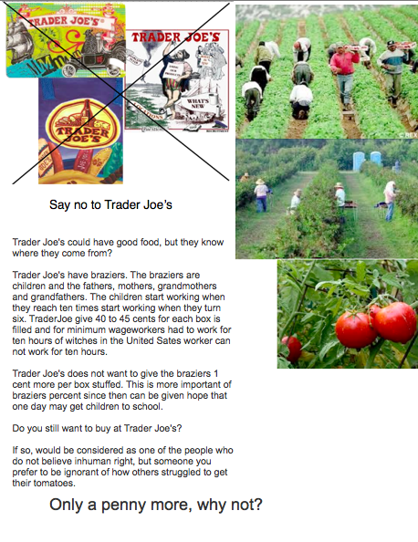 Trader Joe's han braseros. Los braseros son los niños y también los papás, mamás, abuelas y abuelos. Los niños empiezan a trabajar cuando cumplen diez veces empiezan a trabajar cuando se cumplen seis años. Trader Joe dan 40 a 45 centavos de dólar por cada caja que se llenan y para el salario mínimo de los trabajadores tenían que trabajar durante diez horas de brujas en el trabajador Unidos sacia no puede trabajar durante diez horas.