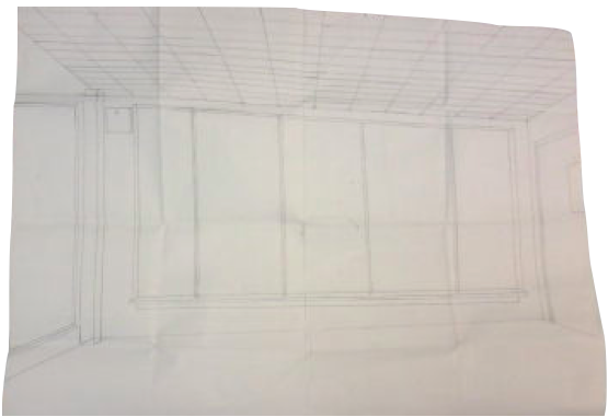 We started this project with practicing drawing regular 3-dimensional boxes, and using the middle of the page as our point of perspective where everything will eventually meet up in the room. Then I looked at weather each of the objects that I drew in the room has a part that sticks out or that comes out of the wall because I have to make it look 3-dimensional. I drew the part that would be apart of the wall so basically the 2-dimensional stuff, then added the 3-dimensional things <the things that has to look like its jumping off the page. I did this by Making lines meet up at the point of perspective, the center of the page.