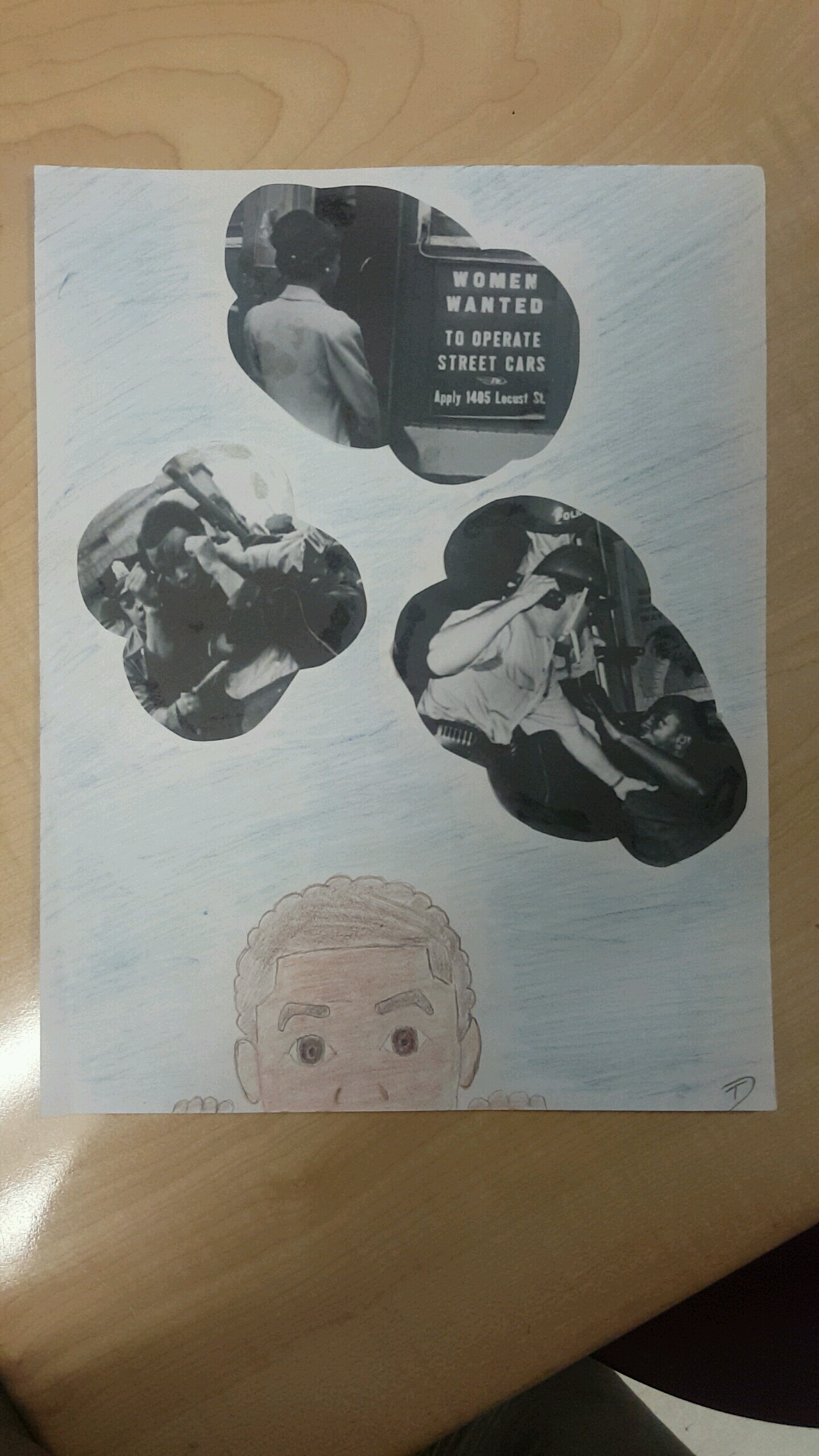 El nombre de mi mural es, Las Nubes de Mi Comunidad. El propósito del muestro cómo la gente vivió en los años 1900. Es un mural de los derechos civiles. El mensaje trae la conciencia de nuestro pasado y nos permite saber a ser conscientes del futuro. El mural cuenta la historia de personas que luchan por sus derechos. Los colores son azul, blanco y negro. Hay tres nubes y los nubes son negros. Dentro los nubes es una escena, dos escenas muestran violencia policial. En la otra escena es una oportunidad del trabajo para una mujer. También, yo he creado este mural para apoderar, representar y simbolizar el pasado a causa de olvidar el pasado. Quiero que la gente mire esto y mira los problemas ahora. Muestra un tema de urgencia. Mi pieza cumple el papel del arte público. Creo que da un enfoque único a un tema común. Mi mural tiene un mensaje poderoso. Murales y arte generalmente provienen de lugares oscuros. El mejor parte sobre el arte es que puede expresarse en una variedad de maneras. Me encanta mi diseño porque muchas personas no lo han hecho y no han hecho su investigación sobre algunas imágenes que estoy recreando.