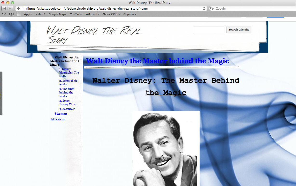 Everyone has seen a Disney movie at least once in their lives. The movies "Cinderella", "Sleeping Beauty", and "Bambi" opened a portal to a magical world far beyond the reality in which we lived. Princess dresses and tiaras were out of stock in children department stores and girls everywhere would dream of living in a castle one day. This was the footprint that Walter Disney left on my generation's childhood memories- these were the dreams that stemmed from Disney productions. For my first quarter English benchmark, I have chosen to create a website about Walter Disney, the master behind the magic.