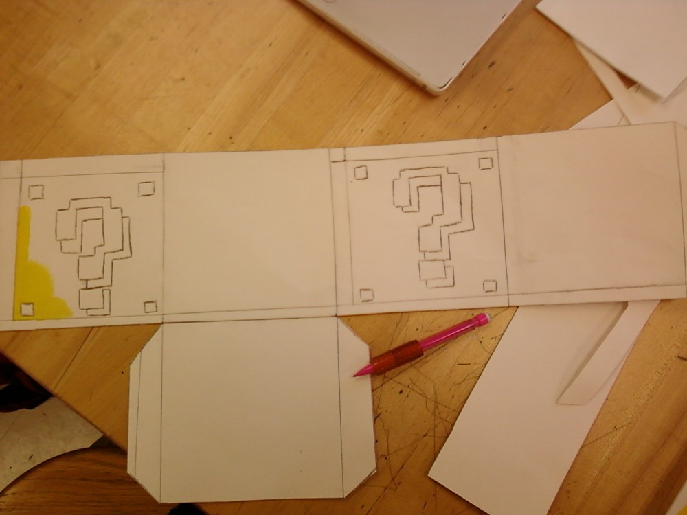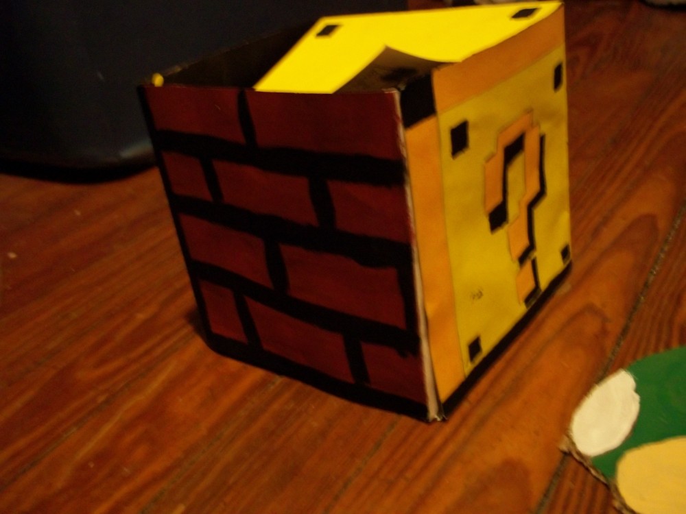 My second piece was for the same person who happens to love video games and specifically Mario games. So I made a personalized question block from cardboard paper using pictures from the internet and images from playing the game myself. I also cut out items that are usually found when a question block is hit: a star, a green/red mushroom, a feather, and a fire flower. After painting all of these items, I made it a little more personal inside the box, painting it my own way and making a story and picture. After glueing everything together, and putting all of the items inside the box, I added in chocolate coins. There were mess ups, and my biggest challenge was the time limit and the time the paint wanted to dry. But everything was finished the way my mind wanted it, and bringing joy to the person all of this was meant for brought a more accomplished and happy feeling inside me than any of my other work could have ever done.