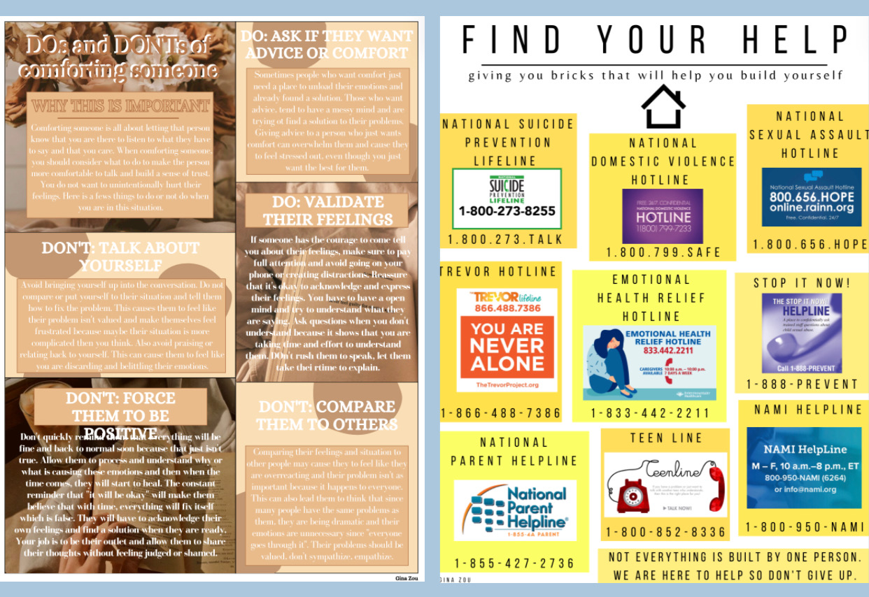 On the Left, the “Do’s and Don’ts of comforting someone”infographic and on the right is the different hotlines poster.