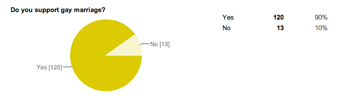 For my piece of individual research, I created a short simple survey about who the survey taker was and if they supported gay rights. The questions were as follows; 1. Male or Female? 2. How old are you? 3. What is your sexual orientation? 4. Do you support gay marriage? 5. If no, why not?