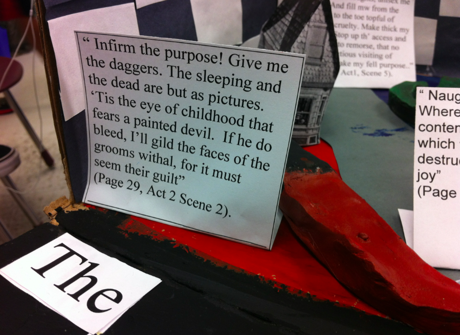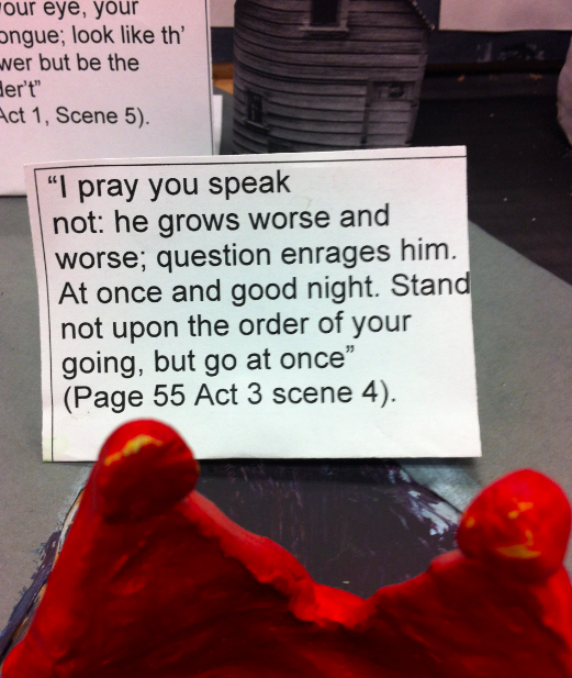 The artwork is based on Lady Macbeth. The sculpting is symbolizing Lady Macbeth’s important key in the book. The first sculpting is about power because at the beginning of the book, she became really obnoxious with the power. She wanted to take over the control and guided her husband, Macbeth to be the king. The next following sculpting is a knife. It shows that Lady Macbeth encourage Macbeth to kill King Duncan so both of them can get the power. There are quotes when she had talked about the dagger. The third sculpting is a crown. Lady Macbeth had the wish to take the crown as a queen to rule the power with her husband. This shows that the power had symbolized lunatic because she was scared that nobles would find out later. The power was too much for her where she had committed suicide. She didn’t really care about living than suffer in pain of killing. So the sculpting shows a memorial grave for Lady Macbeth’s death.