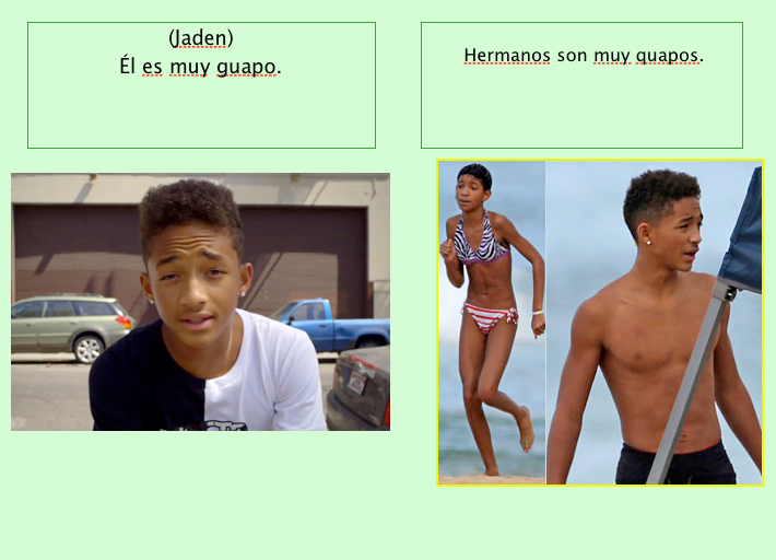 Ellos: (Jaron y Haneef) Ellos es mucho alto. Son deportistas. Jaron le gusta americano football y Haneef le gusta baloncesto. Ambos son divertidos. Ellos muy lindos. No me gusta nada dibujar. Haneef es mi amigo y Jaron es mejor amigo. Haneef color favorito es la rojo. Jaron color favorito es la azul.