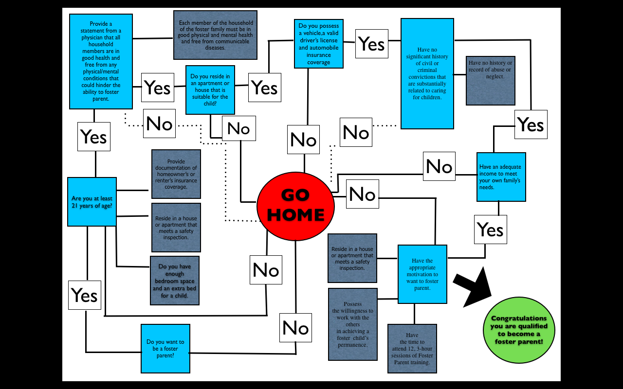 Kourtnee and I (Amirah Burkett) selected the bureaucratic task of becoming a Foster Parents in Philadelphia, Pennsylvania. I believe the hardest part of our project was the flow chart, it was the most complicated. The paperwork we needed to fill out was pretty straightforward and easy being as though we made ours how we wanted to fill it out, and it went into some detail. We couldn't find any official foster parent documents so we piggy backed off of a lot of other applications in other states. The flow chart is very similar to the application and asks most of the same questions. All of the qualifications steps like home inspections, being at least 21 years of age, and at least 36 hours of foster caring classes. I believe some systems have become more complicated because there's always going to be a person who's trying to get around it, so i guess they made it a little more complicated for certain bureaucratic 'tasks'