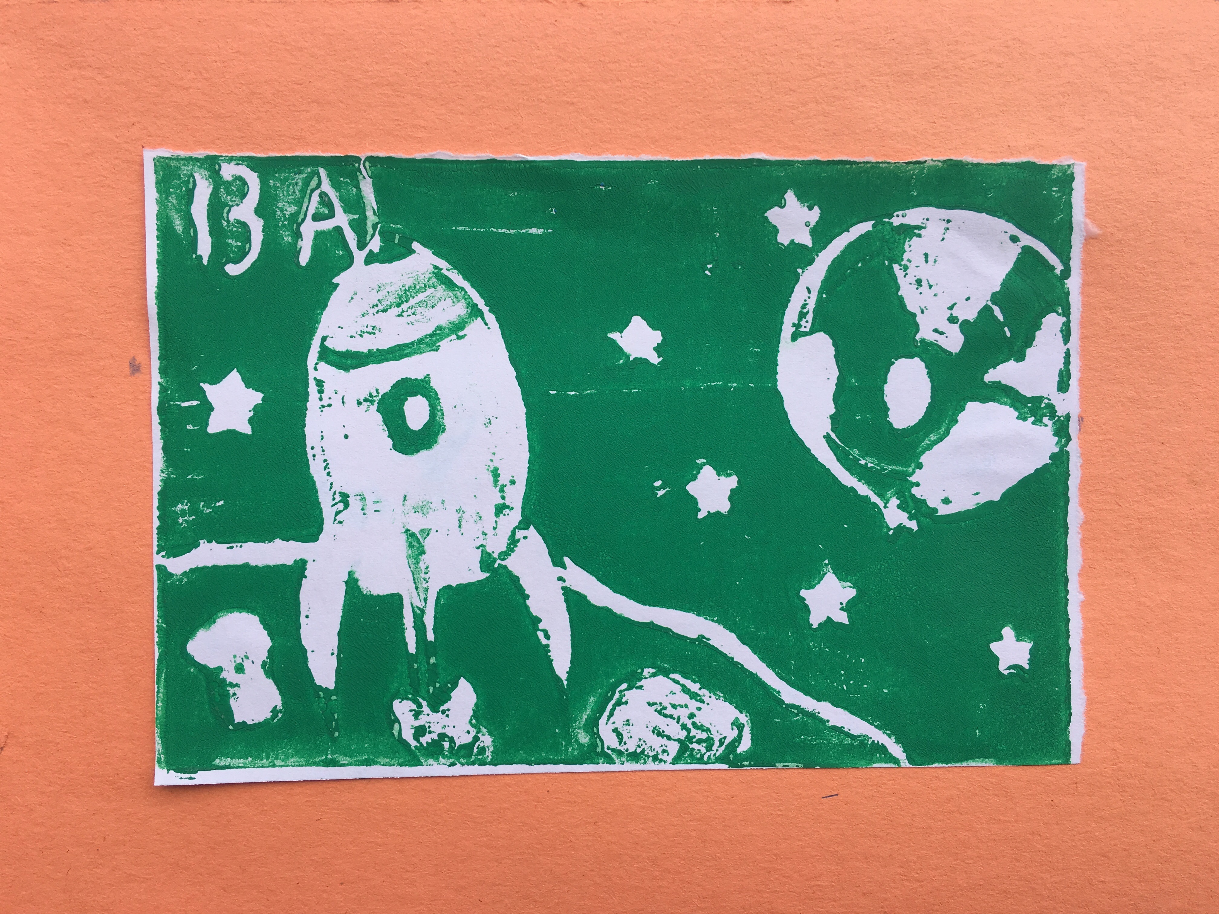My element is Aluminum AL, the atomic number is 13. Sir Humphry in 1809 named the element aluminum and then Britain editor in 1812 wrote it as aluminum due to it harmonizing with many other element names like sodium and potassium. The way I got the idea for the imagery I chose was due to the history of the use of aluminum, I found out that the Apollo 11 spacecraft was made out of aluminum. so I thought that was a good idea to design a space ship landing on the moon. The process I went through to make this print was drawing out the image on a normal piece of paper then I copied it on tracing paper and then I copied it backward on the plate foam paper and identified the negative space by denting the foam on the plate paper. Something I would do differently is not shaded in the negative space and should just outline stuff just so it could look neater. The part of the project that I liked the most was the printing process when we were adding the paint on the image. The steps to complete this process is taking the brayer and dipping it in the printing ink and then rolled it evenly in it and then rolled it evenly again against the foam paper.