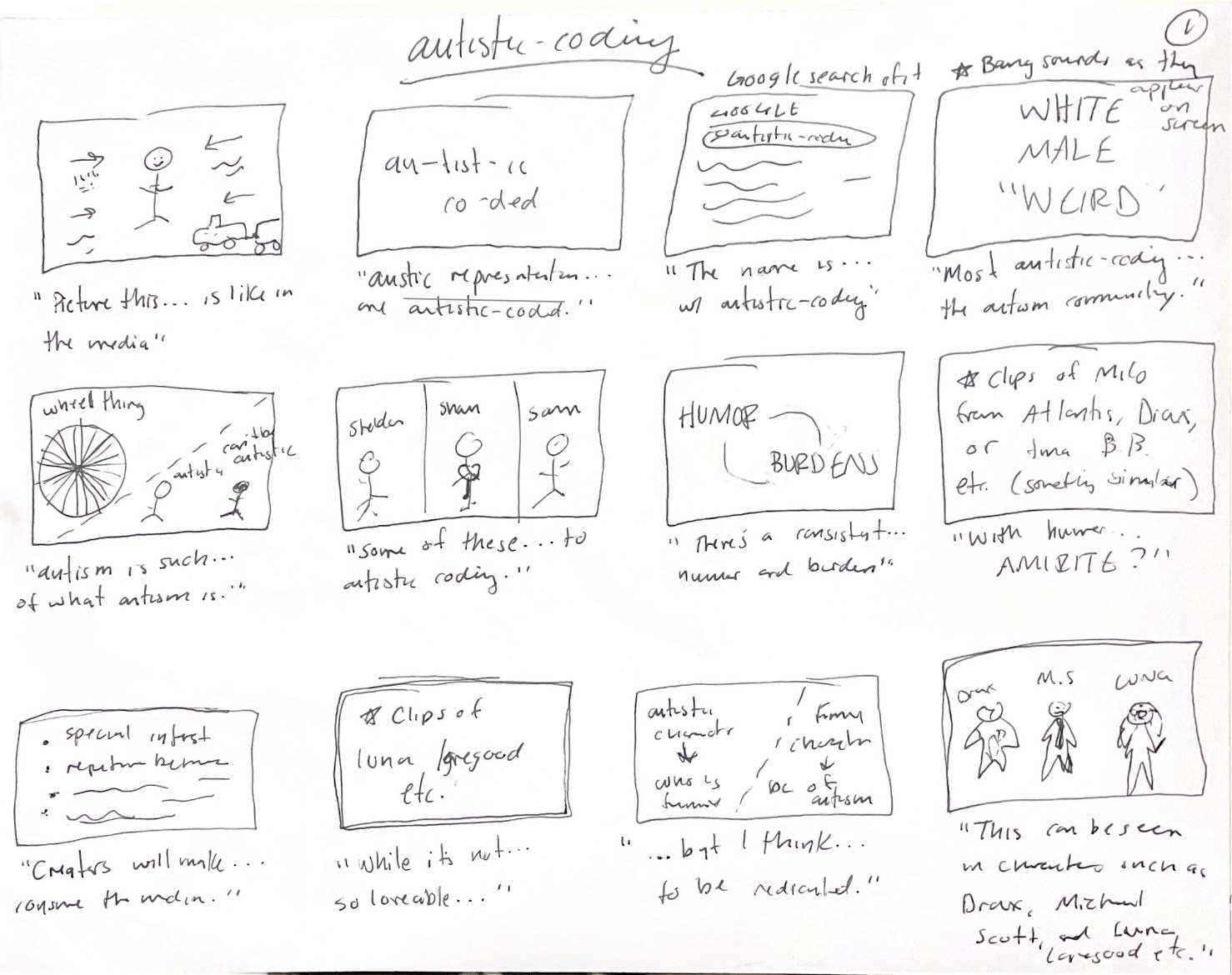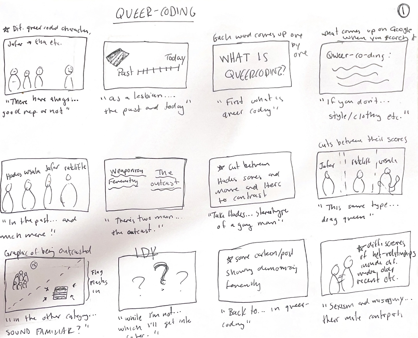 Each video essay had approximately four pages of storyboarding to plan out the visuals with the accompanying voiceover. A page from each one is pictured above. Not every aspect of the story boards came to fruition as I altered and changed some parts, but creating the storyboarding made assembling and sequencing all my video clips much easier.
