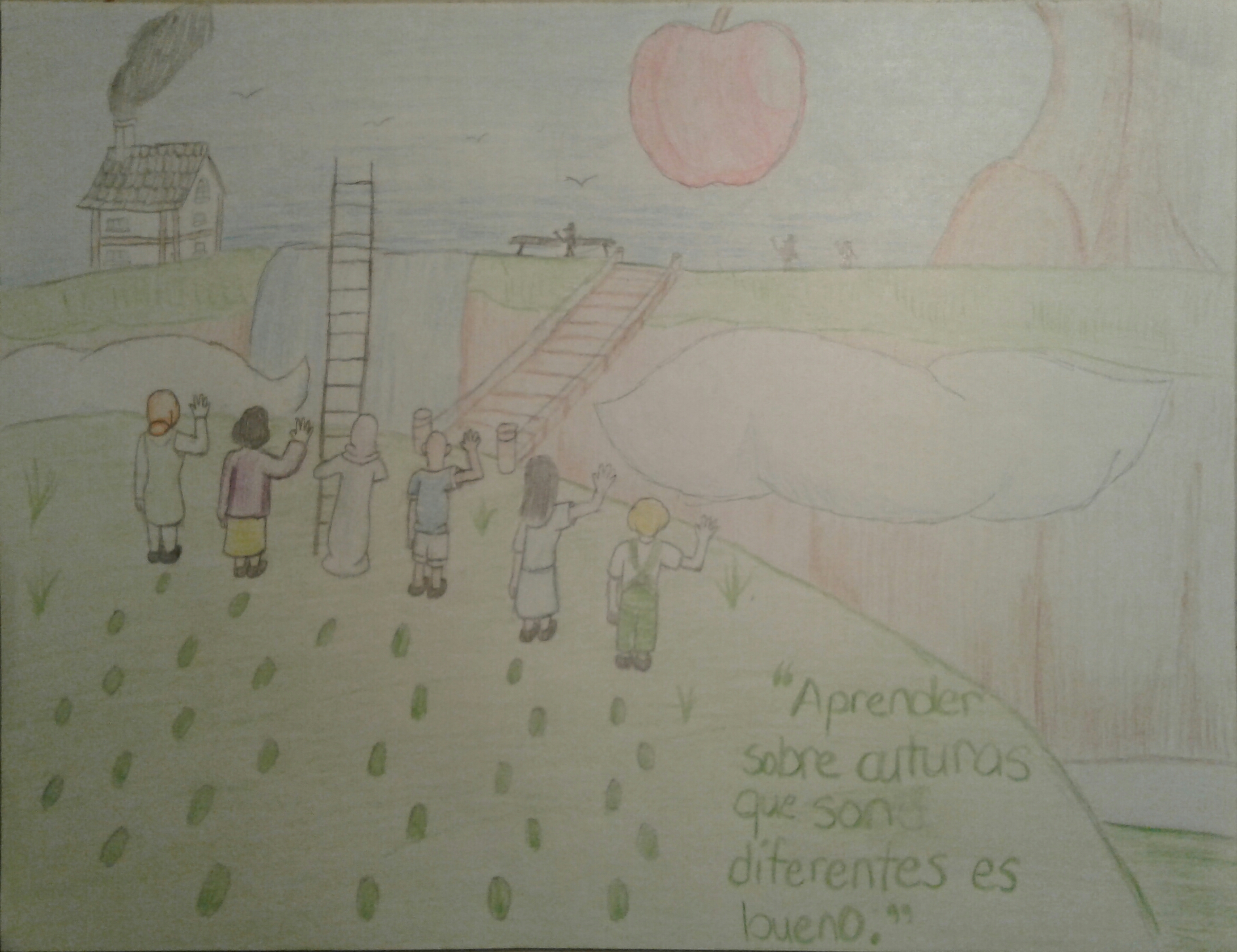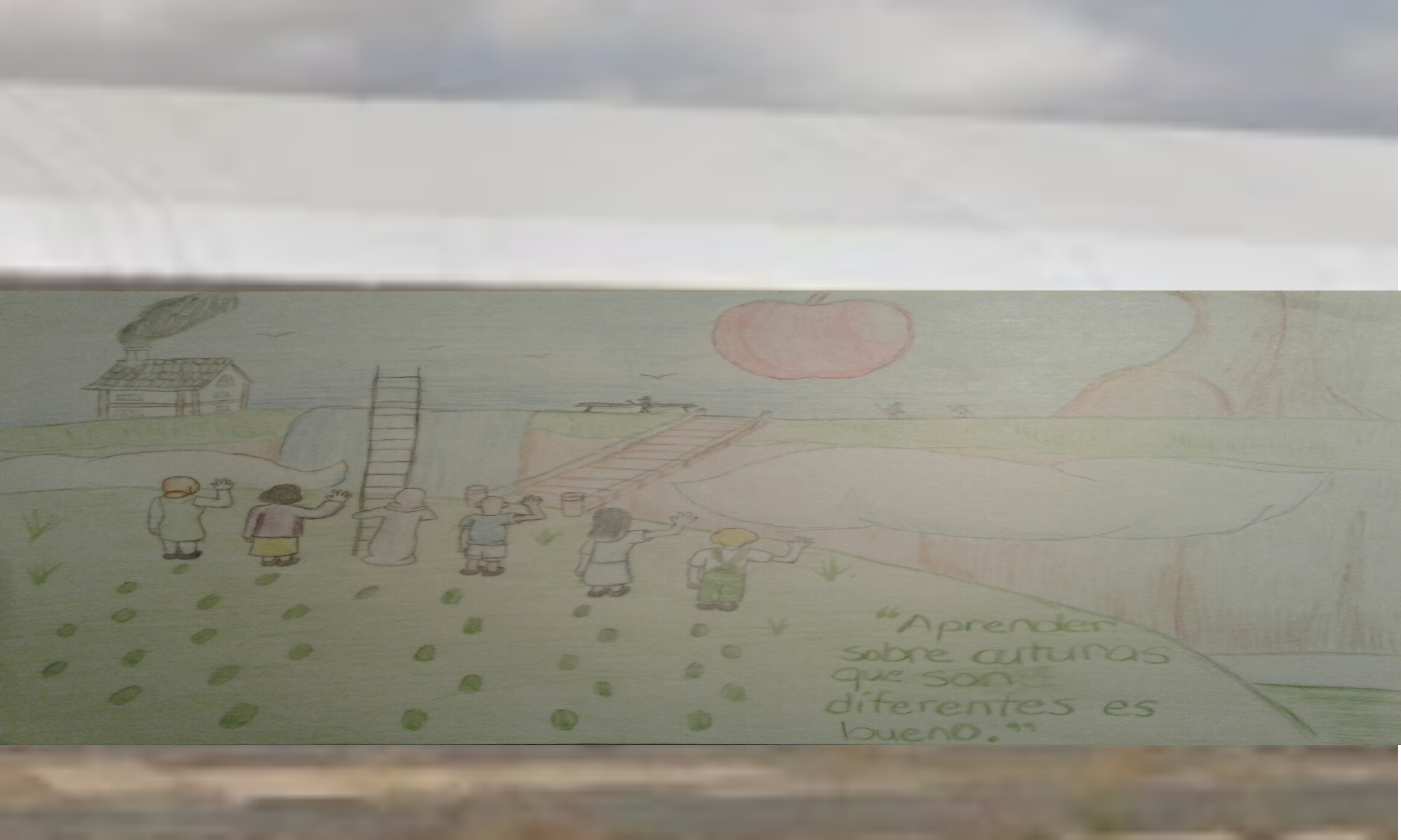 Mi mural tiene una manzana que es grande, para las personas comer en la ciudad o barrio. Las personas son significativa para el mural porque ellos pueden demostrar la diversidad en sur de Filadelfia. Además, la manzana puede demostrar educación o comida que las personas pueden tener a pesar de que sus culturas, y la manzana pueden demostrar los árboles que tienen manzanas en mi barrio. Los temas de mi mural son unidad y diversidad. Por lo tanto, el mensaje es aprender sobre culturas que son diferentes.