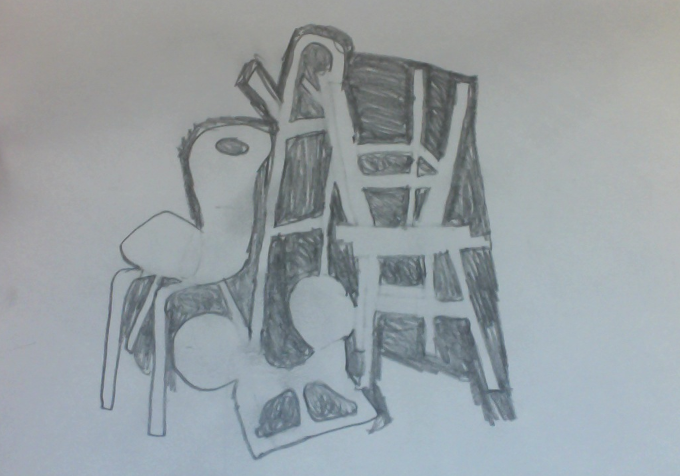 B: Explain how you found negative space in 1. your cut out?, 2. in your still life drawing? 1: The cut out was more of a positive/negative space combination. The negative/positive boundary was used to show detail. Being symmetrical, the drawing had every part negative, but half of the parts were on one side and the other half on the other. 2: In my still life, I found negative space to be anything that was not the background. The stools, the chair, and the other thingy were all white and everything else was black (I did not have time to shade everything).