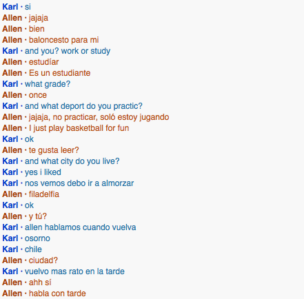 I spoke with a guy from Chile named Karl Reiher. He actually chose to speak with me, barely anyone would respond to my invitations or they declined for a 35 minute period. I spoke to him a day before but during class switch, the session cut and I lost most of the transcript.What did you learn about them? What did you learn from them?