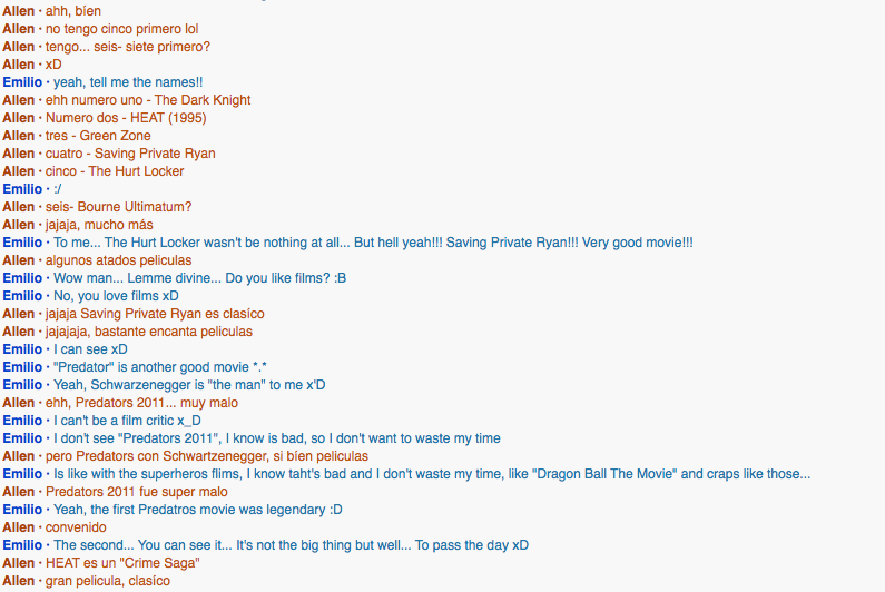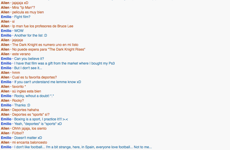 He had very fluent english, the guy likes videogames, not necessarily first person shooters. A fan of action movies, those much like The Terminator, also fight movies, his favorite is "Fight Club."How did this interaction help you move towards achieving your personal goal?