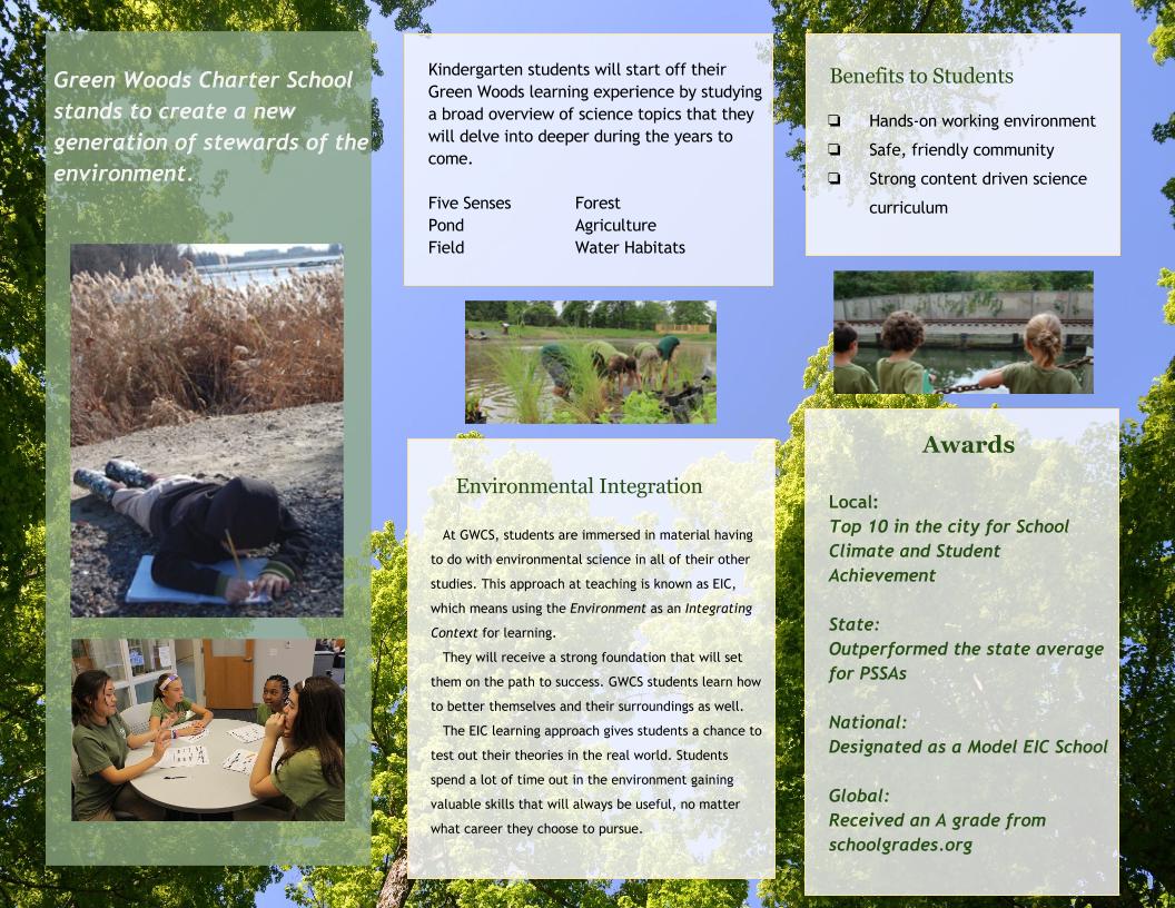 My Capstone was inspired by the internship I have had at my old elementary and middle school, Green Woods Charter School, for the past three years. Over the course of the past five years GWCS has changed a lot and collectively been in four very different school buildings. The school currently resides in it's permanent location that they built from the ground up. Not only is the school in a brand new building, but the GWCS community has more than doubled and there are a lot of families that aren't as familiar with what GWCS is all about. The adjusting process was difficult so for the first part of my Capstone I made a informational brochure for prospective families to use to get a glimpse at the school.