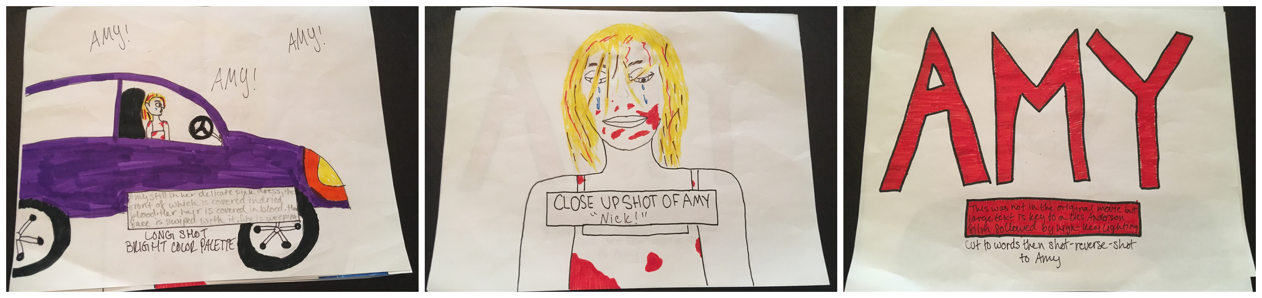 Wes Anderson uses an array of different shots in his films as well, with some of his favorites being medium and close up shots. He uses medium shots to establish the setting of his scenes and uses close ups to convey an emotion of a character. The part with the most emotion in the scene we chose, is when Amy gets out the car wearing a white dress covered in blood and pretends to cry. So we recreated that frame by doing a close up of Amy as she is staring at Nick. Wes Anderson also utilizes transition slides in Films that has Bold lettering. We created our own transition slide where we wrote AMY in bold font and colored it in red, we the slide to transition from a close up of Amy falling into Nick’s arms to a wide shot of Amy in Nick’s arms.