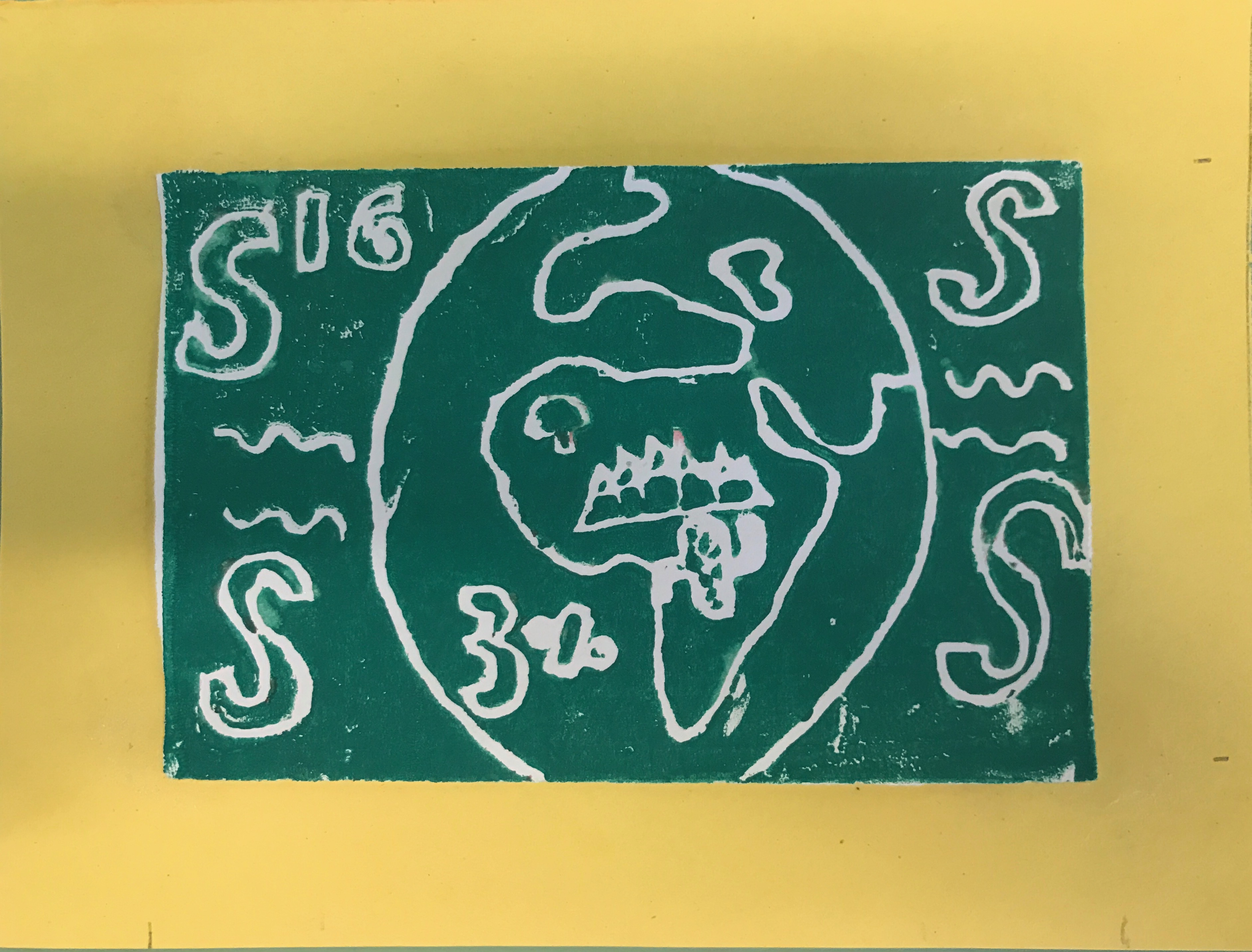 My element is named sulfur and the atomic number is 16. It is a nonmetal and the atomic symbol is S. Sulfur is in the bible with the name brimstone and it is mentioned in the Odyssey. It was discovered in 1777 by Antoine Lavoisier. He discovered that it was an element and not a compound. Sulfur takes up 3% of the earth’s mass, so I included an earth and with a “3%” on it. I did this because I thought it was the best way to represent that sulfur is 3% of the earth’s mass. I first brainstormed ideas for my print, and chose a final idea. Once we had our final design on paper, we traced it onto tracing paper. After that, we carved our design onto a plate. We then rolled paint onto the plates and then pasted them on a piece of paper. After one week, the paint dried and we cut out the pictures and pasted them onto a paper with a one inch frame. I would have made my design a little less complicated if I were to do it again. It is difficult to completely understand the idea of my print/matt at first glance. I enjoyed making the design for our print. It was fun researching our element and brainstorming possible ideas for our print.