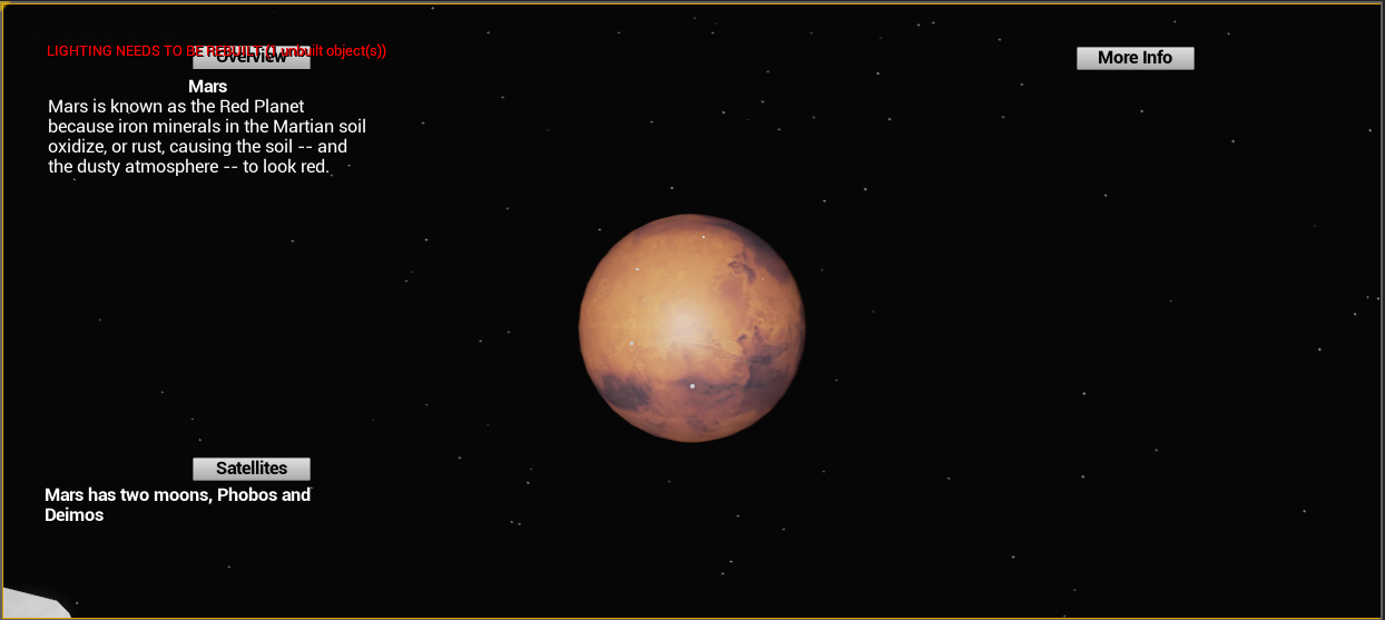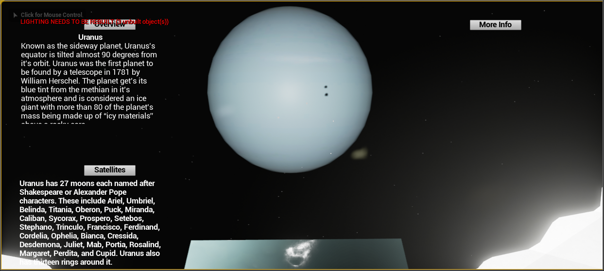 I started out working on the design of the simulation in the Unreal Engine creating the cockpit and menu displays of the spaceship that would serve as our HUD. However as the only one in the group with knowledge of Unreal, I ended up also working on the code. During the year I finished the design of the spaceship, tried to get the ship to move, made a planet map for each in the solar system complete with HUD’s showing information on the planet and made starry background. However I was never able to finish the coding and could not get the ship to move even after a month of troubleshooting and consulting with Unreal coders. However I taught several of the sophomores in the project how to use Unreal and will continue to help out throughout the summer.