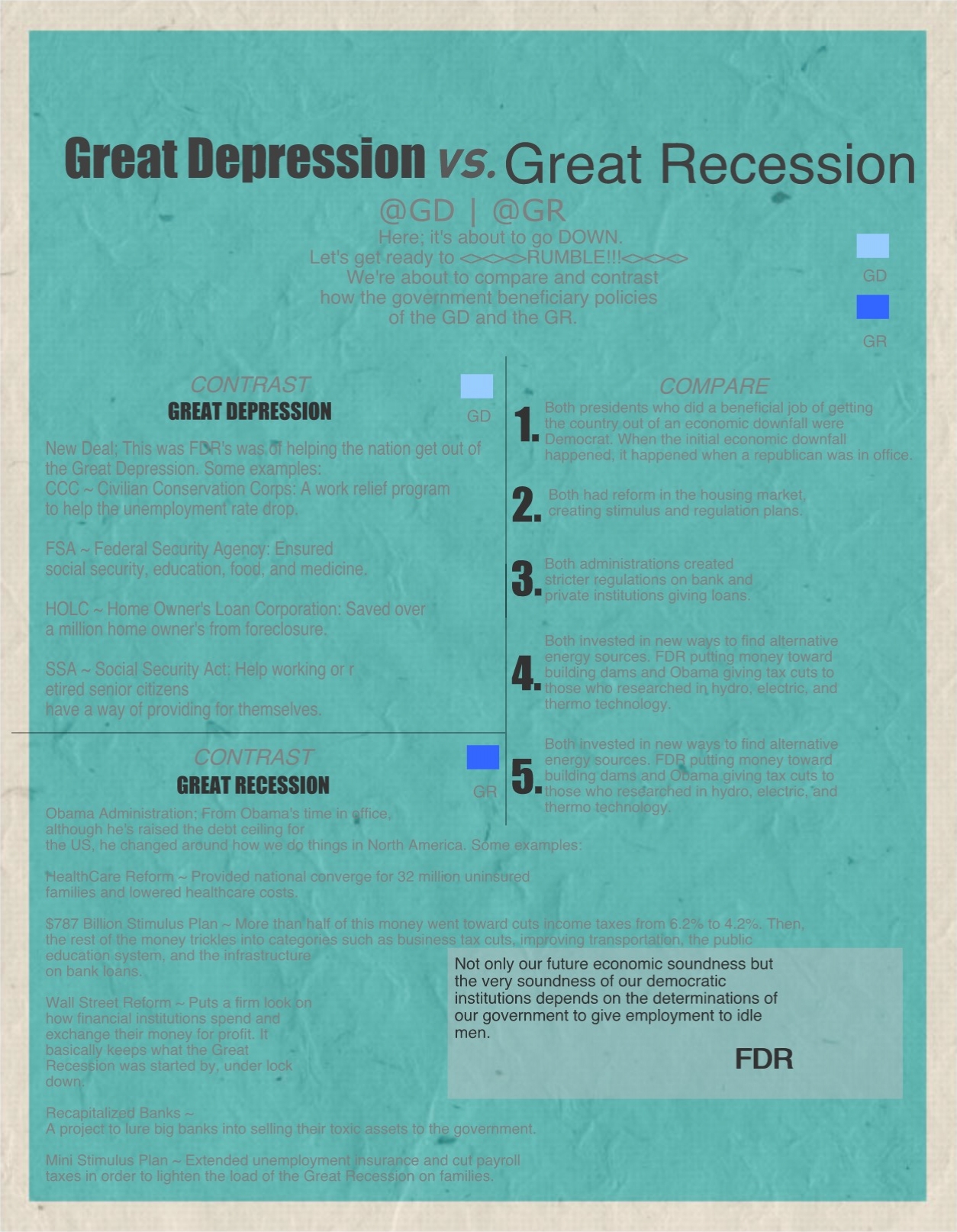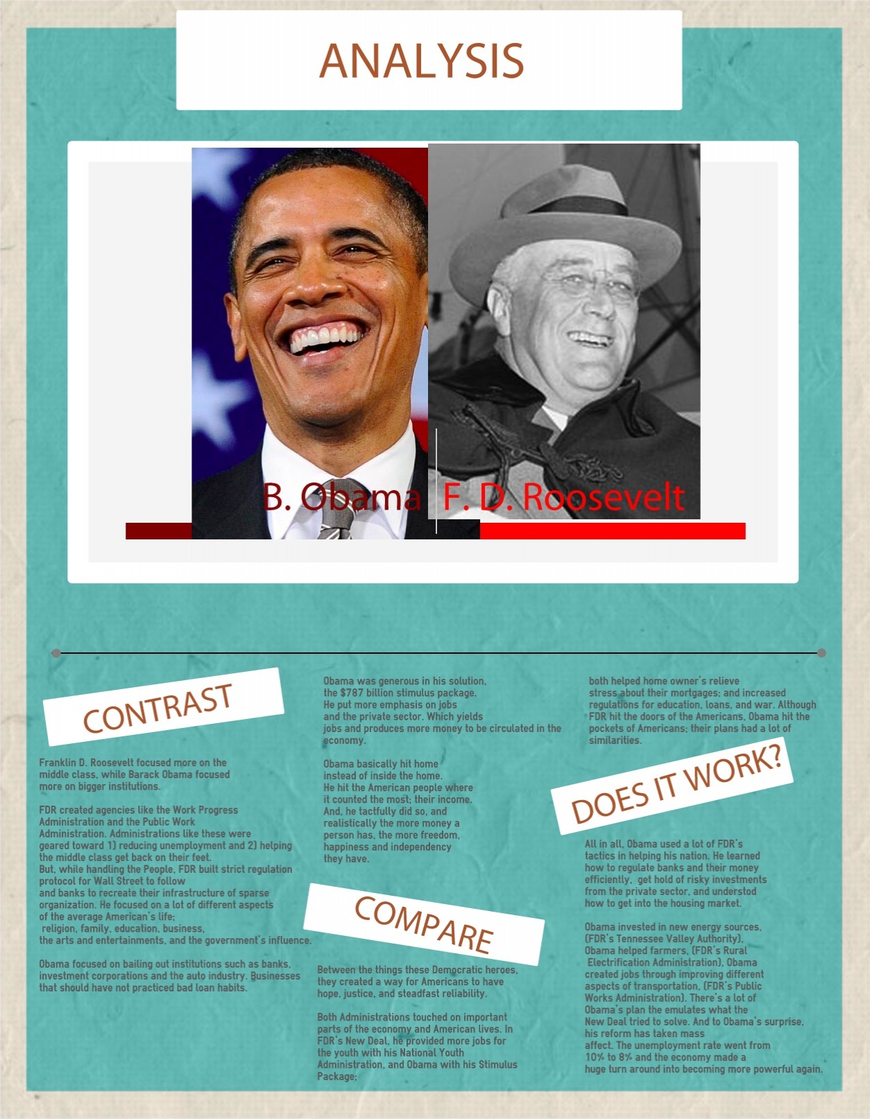 • Here it basically explains the programs FDR planted what was yielded. It’s to show the different policies of Hoover and FDR. Either the government supports its people, or the people supporting the government. It’s about the programs FDK established, their effects, and how they it influenced a turnaround from the Great Depression.