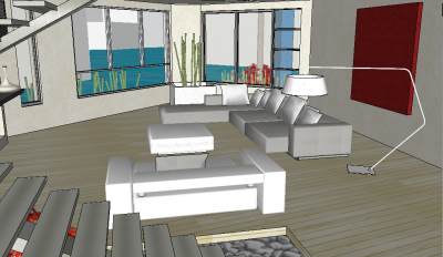 En la sala, es muy grande. Está cinco sofás, tres mesas, una lámpara, dos pinturas, cuatro plantas, está trece ventanas, un tele, y una escalera.