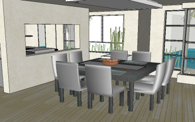 En él comedor, es pequeña. Está ocho sillas y una mesa.