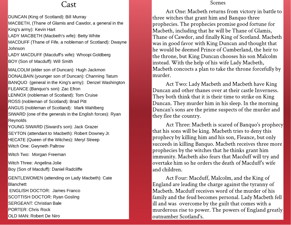 An important part of our playbill is the color scheme. We decided to make the background red because of the bloody themes that are in Macbeth. The red also matches our cover art. We also thought that the linear style of coloring the background was very appealing and added a little variety.We also decided to do an act-by-act summary to inform the audience about the play they are about to watch.