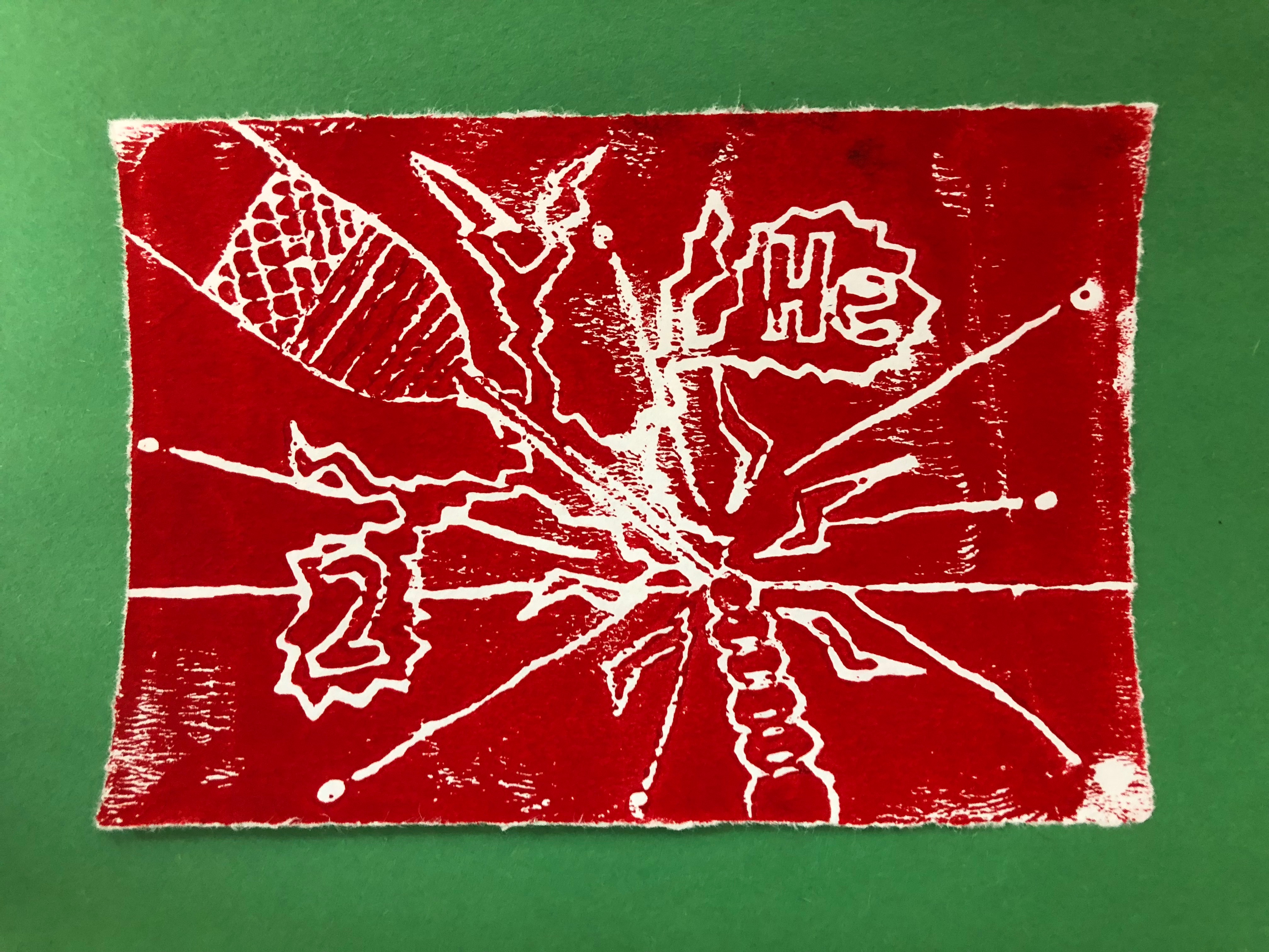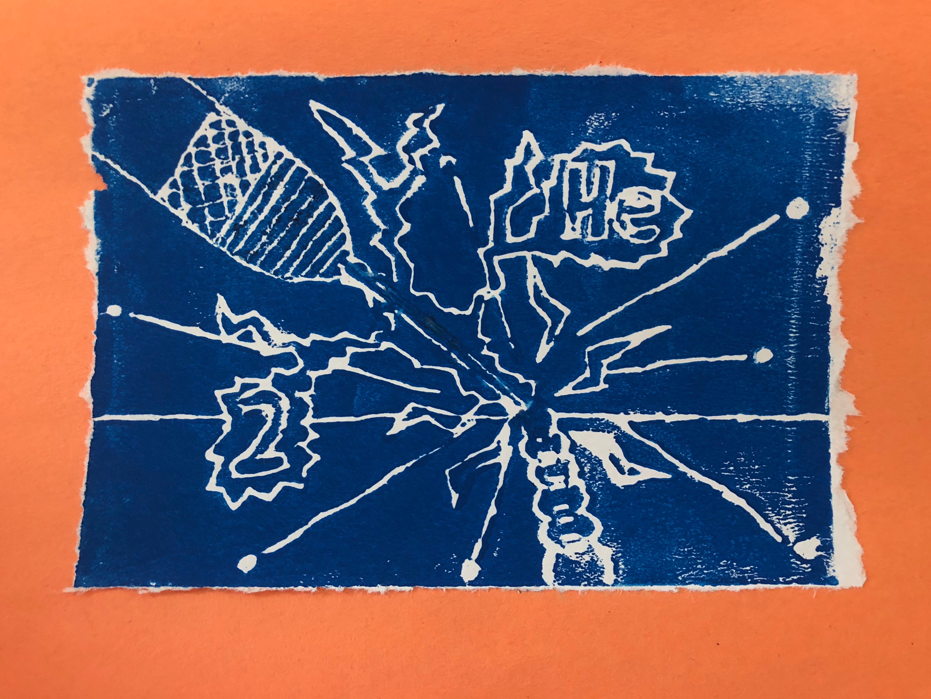 My element is Helium. Its atomic symbol is "He" n the atomic symbol is "2". Helium is one of the most basic elements in the universe. It has 2 protons, neutrons, and electrons. Helium is lighter than air so it will float. Helium is commonly used in balloons for this property. Helium is also used in welding. The helium will protect the fresh weld for a moment so it can cool off enough for the weld to be functional. In my prints, you have a welder that is in the middle of welding. There is a lot of chaos in actual welding which is accurately depicted in the print. For the process of making the print, I started off with a sketch and then transferred that to tracing paper. I then put the tracing paper on a foam plate and traced the image onto the foam. From there, I put ink on the foam and put that on the paper. If I were to do this again, I would try to find a better tool for making lines in the foam. The lines I have now are a bit too thick. The part I enjoyed the most was the sketching. I liked being able to see what worked and what didn't. It was helpful for the result of my final prints.
