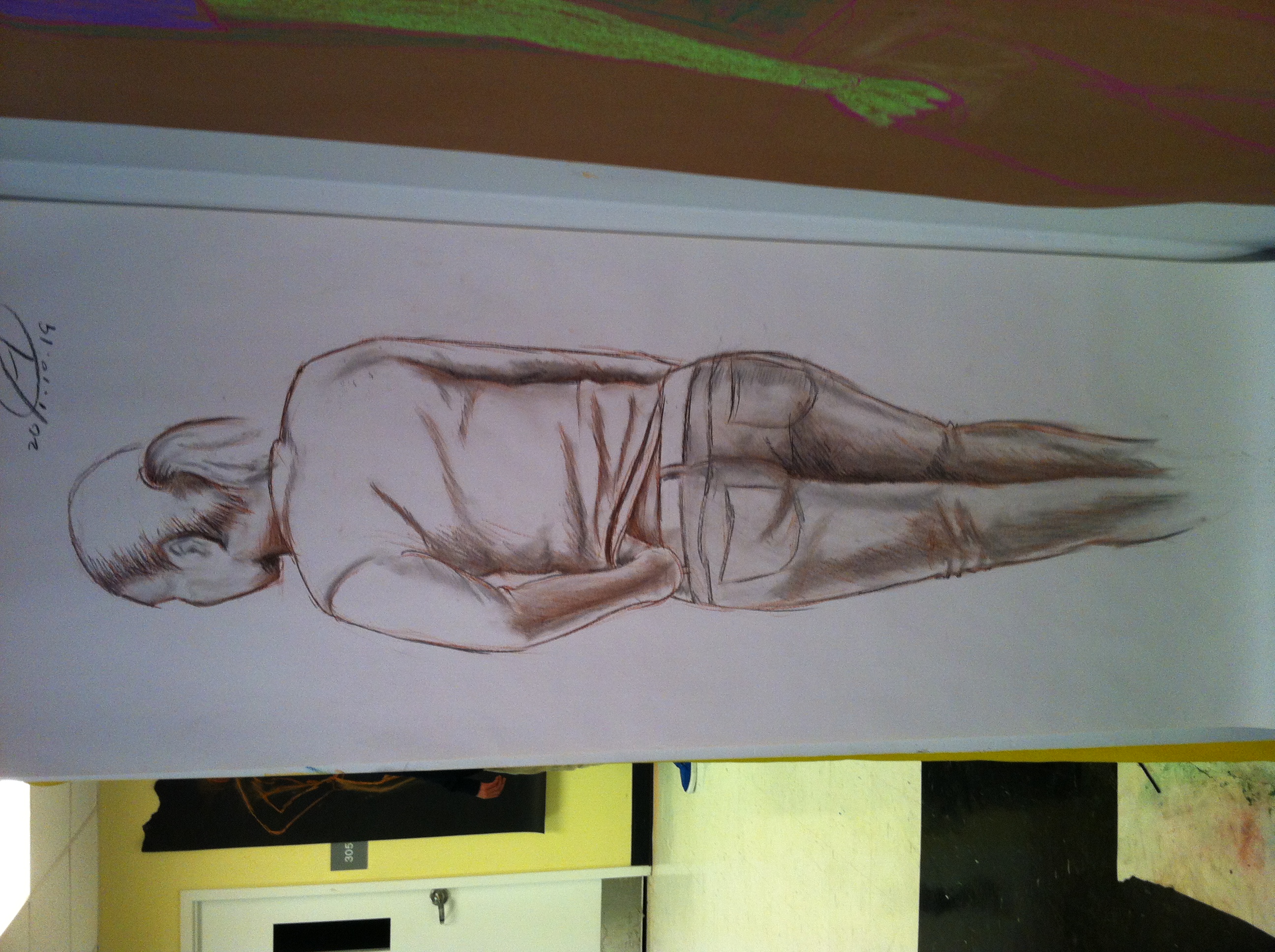 As I am not very familiar with drawing on such a big paper, it is a bit weird for me in the beginning of the drawing. But after I measured the ratio of different parts of the model's body, the drawing gradually became easier. Just as I said, the result turned out to be okey, but I think I have to focus on the congruity of the ratio of a person's upper part of the body to the bottom part.For example, in this portrait, the legs of the model should be longer.