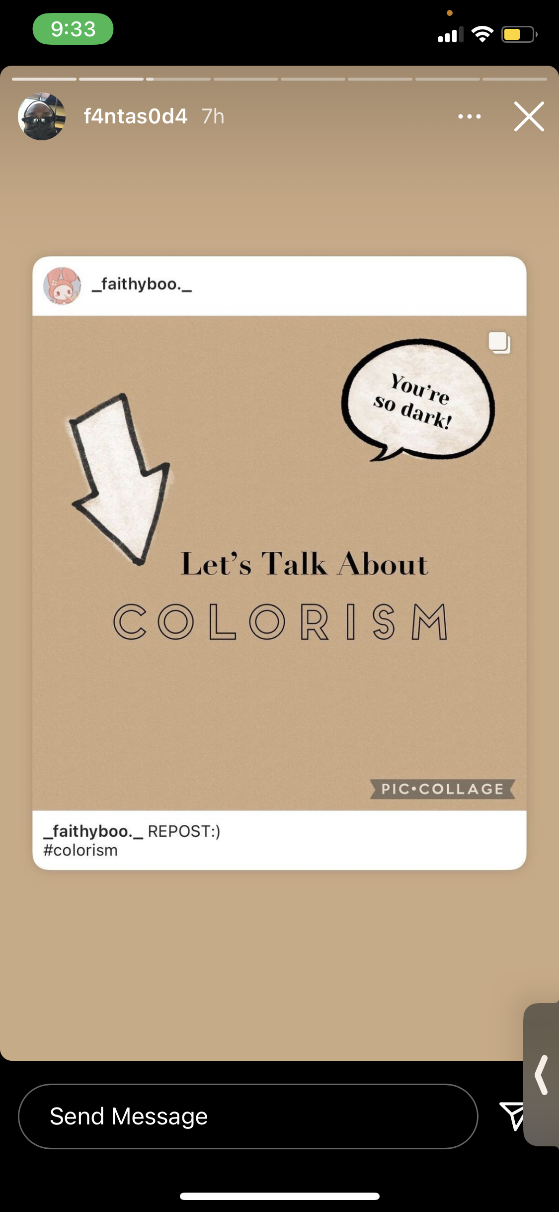 As you can see My friends helped me repost and spread awareness too about the topic. I tried my best to reach out to so many people and I think I did a good job because if I see other people liking it then it must be good for people to realize it’s that important. I think I have the privilege to share about what I know about my topic and how it effects people with darker skin tone. I know it can be hard seeing yourself if you are dark in the media or just being in life because some people can not going to except you but If you are a dark skin person, just know you matter. Everything you do and say matters and you are a beautiful person, don’t like your skin color take over you… embrace yourself and own your skin.