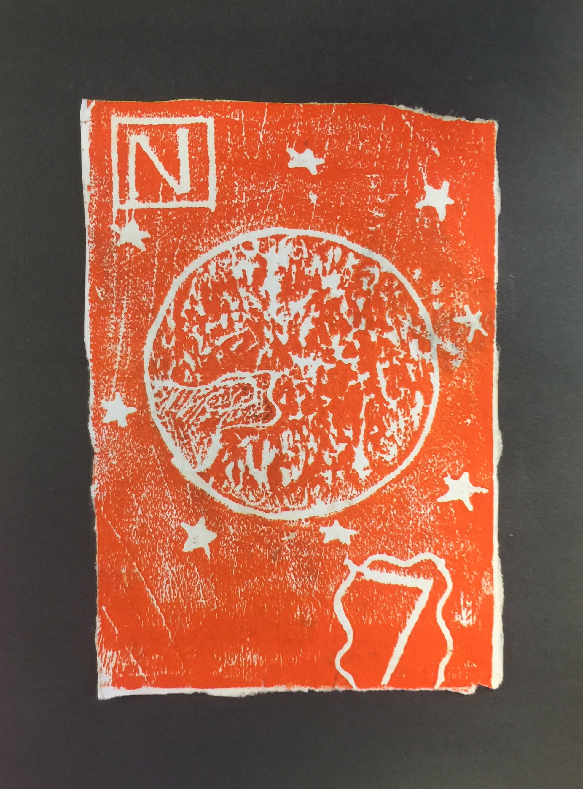 My imagery was the planet Venus. I chose this because Venus had been proven to some amount of nitrogen in its atmosphere. My process for making this was pretty simple. I paper sketch and transferred it into the plate (making sure it was reverse). After that I rolled the ink on the plate until I heard the tacky sound. Finally I put it on paper. If I could redo this, I would have put more depth into the plate. I loved when I got to see my finished product. I just felt really proud of it.